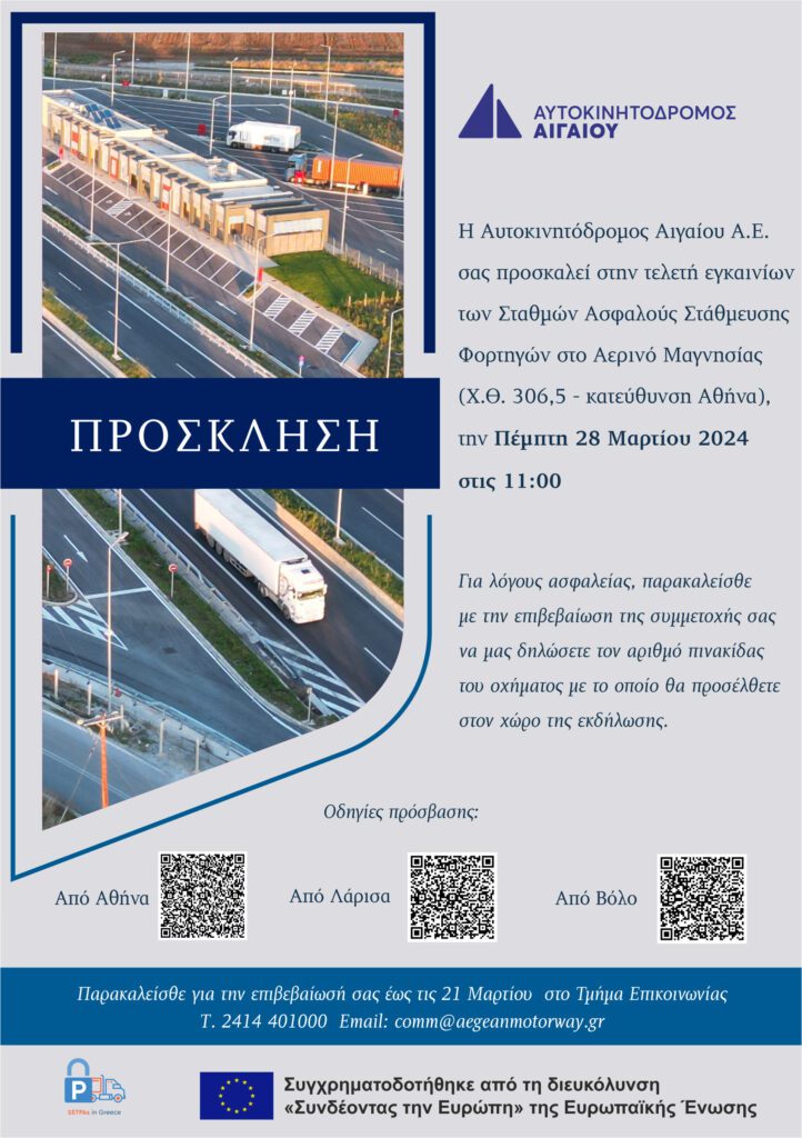 Τελετή εγκαινίων των Σταθμών Ασφαλούς Στάθμευσης Φορτηγών στο Αερινό Μαγνησίας, από τους πρώτους που λειτουργούν στην Ελλάδα, θα πραγματοποιηθούν την Πέμπτη 28 Μαρτίου στις 11:00.