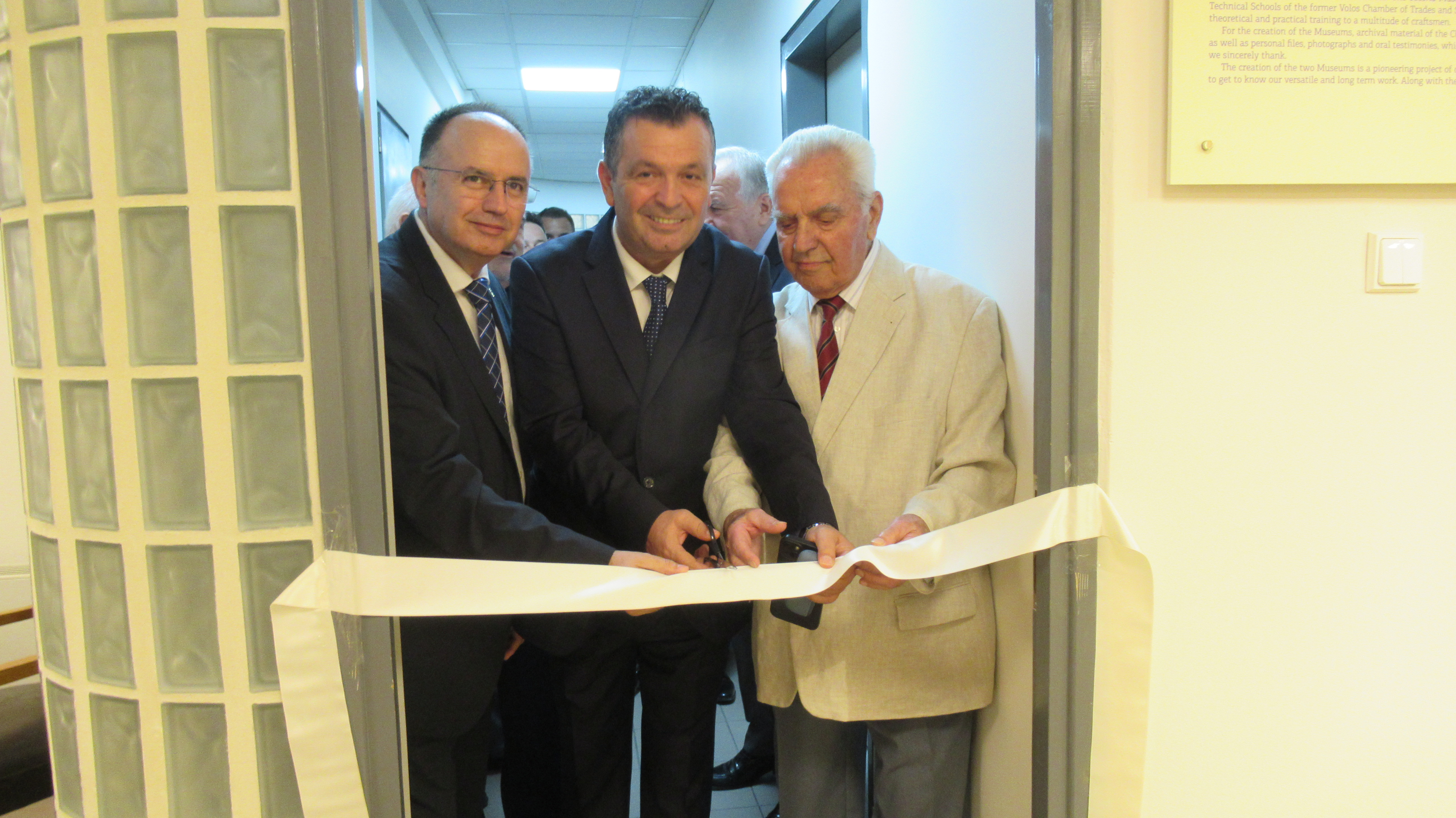 Την κορδέλα του Μουσείου των Επαγγελματικών και Τεχνικών Σχολών Βόλου έκοψε φανερά συγκινημένος η «ζωντανή ιστορία» των σχολών και πρώην καθηγητής αυτών ο κ. Ιωάννης Κολοβός μαζί με τον και τον Πρόεδρο της ΓΣΕΒΕ κ. Καββαθά.
