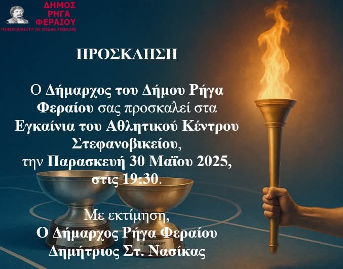 Ο Δήμος Ρήγα Φεραίου εγκαινιάζει την Παρασκευή 30 Μαΐου 2025, στις 19:30, το νέο Αθλητικό Κέντρο Στεφανοβικείου, παρουσία του δημάρχου Δημήτρη Νασίκα, ο οποίος κάνει λόγο για ένα σημαντικό έργο με αναπτυξιακή προοπτική για την περιοχή.Στο πλαίσιο της εκδήλωσης θα παρουσιαστούν για πρώτη φορά στη Θεσσαλία τα ιστορικά ευρωπαϊκά τρόπαια Μπάσκετ του 1987 και του 2005, δίνοντας ιδιαίτερη αίγλη στη βραδιά.Οι εκδηλώσεις αναμένεται να είναι πλούσιες, με παρουσιάστρια τη Νατάσα Κουβελά, η οποία κατάγεται από το Βελεστίνο.