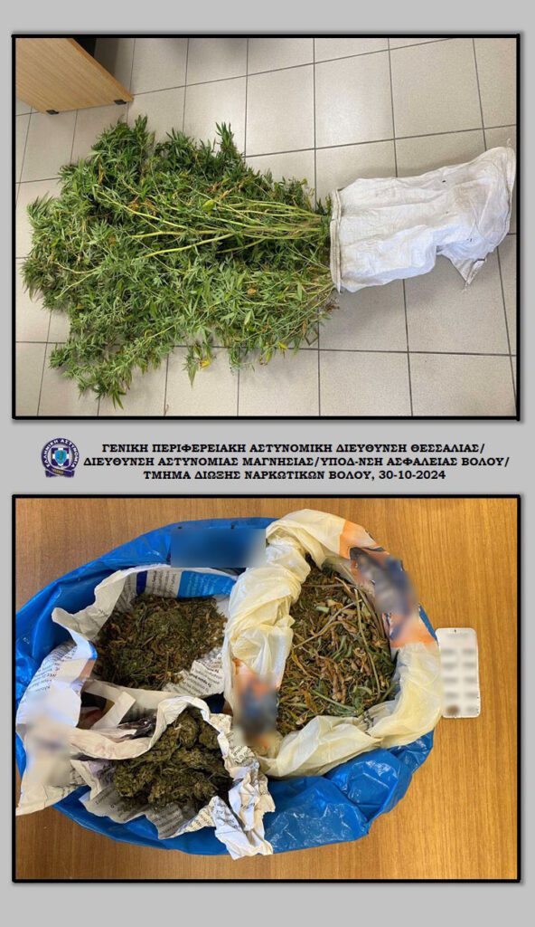 Συνελήφθη, χθες (29-10-2024) το πρωί στον Βόλο, από αστυνομικούς του Τμήματος Δίωξης Ναρκωτικών σε συνεργασία με αστυνομικούς της Ο.Π.Κ.Ε. της Υποδιεύθυνσης Ασφάλειας Βόλου, ένας ημεδαπός άνδρας, για παράβαση της νομοθεσίας περί ναρκωτικών.Ειδικότερα, σε νομότυπη έρευνα που διενεργήθηκε στην οικία του, ύστερα από κατάλληλη αξιοποίηση στοιχείων, βρέθηκαν συνολικά και κατασχέθηκαν:• στον αύλειο χώρο, -2- πλήρως αναπτυγμένα δενδρύλλια κάνναβης, ύψους περίπου -2- μέτρων το καθένα,• στην αποθήκη, μία νάιλον συσκευασία με ποσότητα φυτικών αποσπασμάτων κάνναβης, βάρους -75,23- γραμμαρίων,• στο εσωτερικό της οικίας, δύο χάρτινες συσκευασίες με ποσότητες ακατέργαστης κάνναβης, συνολικού βάρους -37,78- γραμμαρίων, καθώς και -9- ναρκωτικά δισκία, χωρίς την απαιτούμενη ιατρική συνταγή. Ο συλληφθείς θα οδηγηθεί στον κ. Εισαγγελέα Πλημμελειοδικών Βόλου.