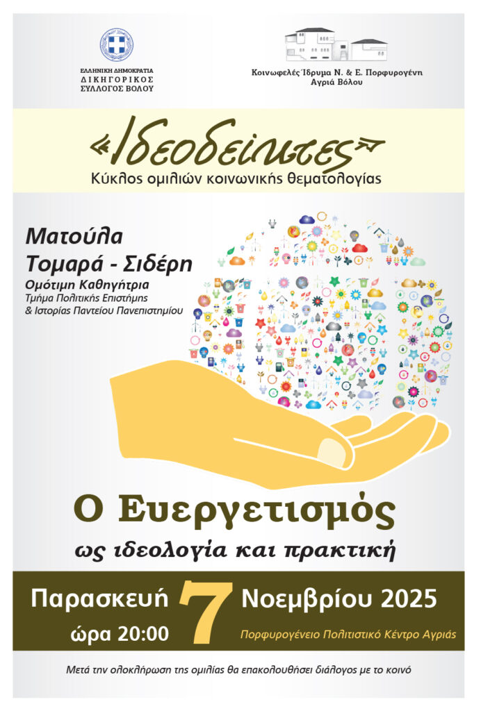 Στο πλαίσιο αυτό, η τέταρτη (4η) από τις συνολικά έξι (6) ομιλίες, έχει ως τίτλο «Ο ΕΥΕΡΓΕΤΙΣΜΟΣ ΩΣ ΙΔΕΟΛΟΓΙΑ ΚΑΙ ΠΡΑΚΤΙΚΗ»», ομιλήτρια την κα ΜΑΤΟΥΛΑ ΤΟΜΑΡΑ ΣΙΔΕΡΗ Ομότιμη Καθηγήτρια τού Τμήματος Πολιτικής Επιστήμης και Ιστορίας του Παντείου Πανεπιστημίου και θα πραγματοποιηθεί την Παρασκευή 7η Νοεμβρίου 2025 και ώρα 20:00μ.μ. στο Πορφυρογένειο Πολιτιστικό Κέντρο Αγριάς.