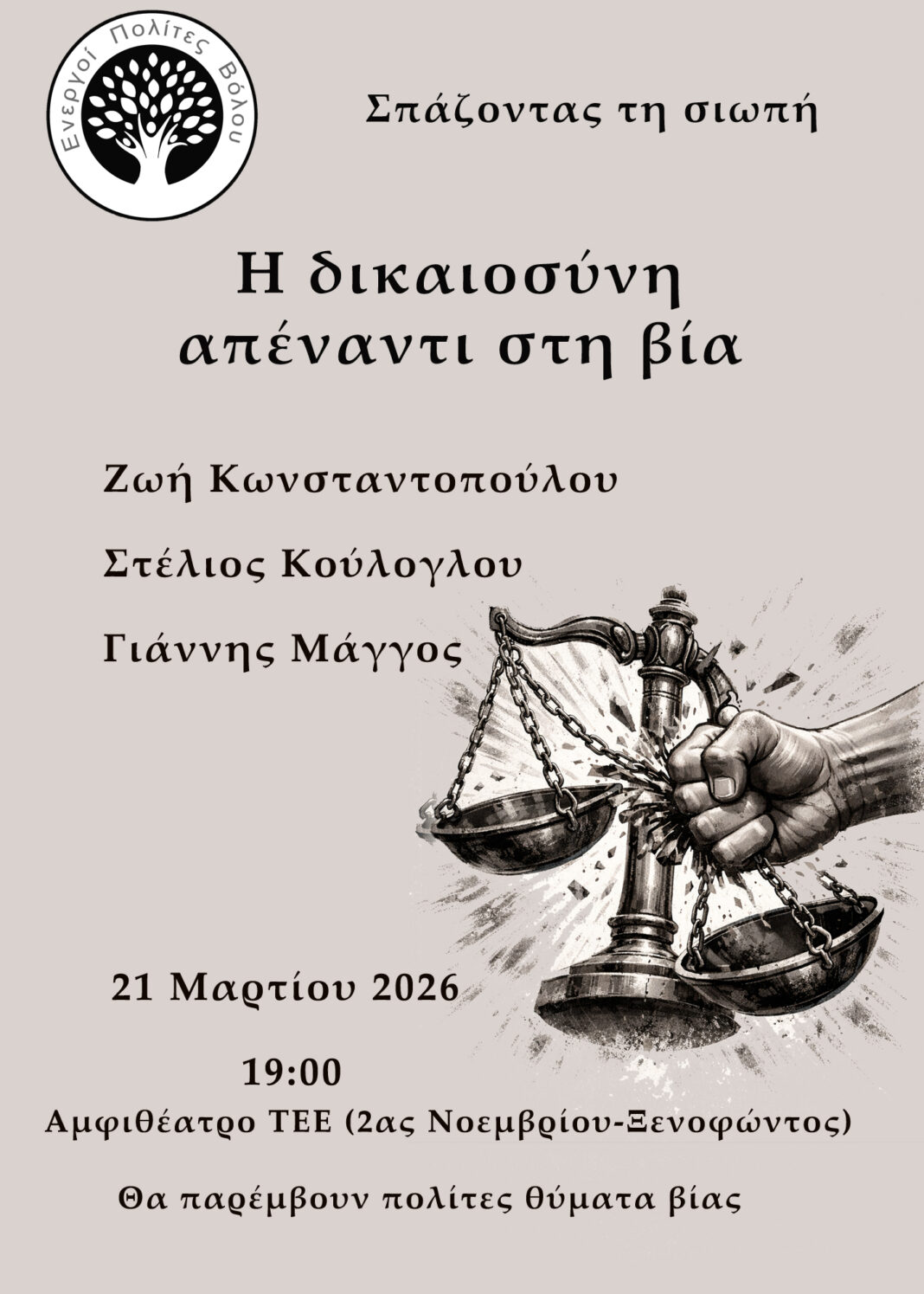 Οι Ενεργοί Πολίτες Βόλου διοργανώνουν εκδήλωση με τίτλο “Σπάζοντας τη σιωπή-Η δικαιοσύνη απέναντι στη βία”, το Σάββατο 21-3-2026, στις 19:00 στο αμφιθέατρο του ΤΕΕ Μαγνησίας (2ας Νοεμβρίου-Ξενοφώντος).