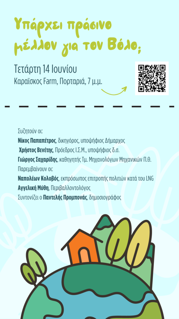 Ο  ανεξάρτητος Δημοτικός Συνδυασμός «Συμμαχία για τον Βόλο» διοργανώνει προγραμματική συζήτηση με θέμα: «Υπάρχει πράσινο μέλλον για τον Βόλο;» την Τετάρτη 14 Ιουνίου στις 7 μ.μ., στο Καραΐσκος Farm () στην Πορταριά.