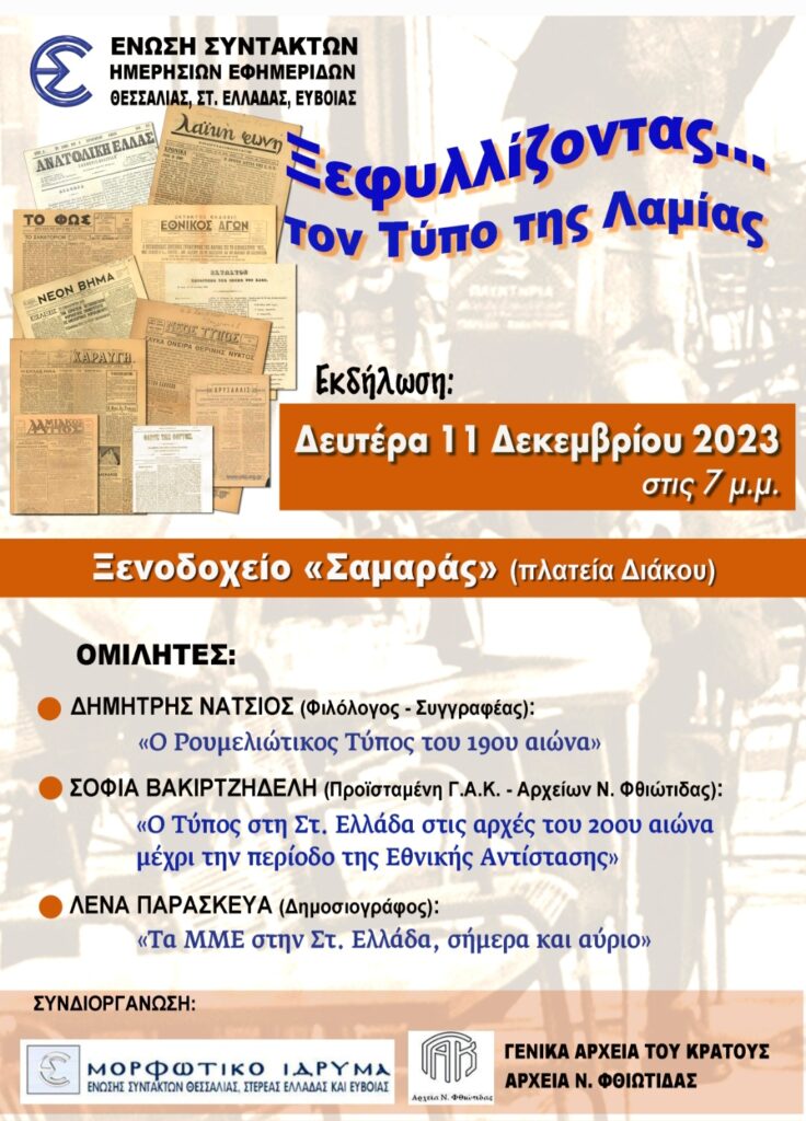 Μια ενδιαφέρουσα εκδήλωση για τον Τύπο στην Στερεά Ελλάδα διοργανώνει την ερχόμενη Δευτέρα, 11 Δεκεμβρίου 2022, στην Λαμία, το Μορφωτικό Ίδρυμα της Ένωσης Συντακτών Ημερησίων Εφημερίδων Θεσσαλίας, Στερεάς Ελλάδας και Εύβοιας (ΕΣΗΕΘΣτΕΕ) σε συνεργασία με τα Γενικά Αρχεία του Κράτους Ν. Φθιώτιδας.