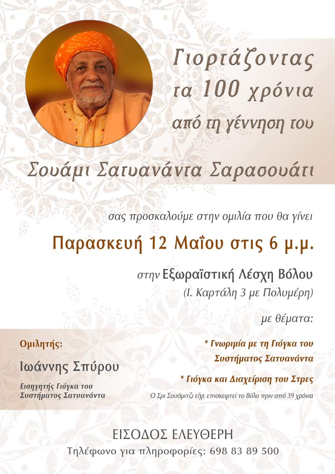 Εκδήλωση γνωριμίας με τη γιόγκα του Συστήματος Σατυανάντα με την ευκαιρία της συμπλήρωσης 100 χρόνων από τη γέννηση του Σουάμι Σατυνανάντα Σαρασουάτι θα πραγματοποιηθεί στο Βόλο, την Παρασκευή 12 Μαϊου 2023 στις 6 το απόγευμα στην αίθουσα της Εξωραϊστικής Λέσχης Βόλου (Ι.Καρτάλη 3 – Πολυμέρη) με κεντρικό ομιλητή τον Ιωάννη Σπύρου – εισηγητή γιόγκα του Συστήματος Σατυανάντα. Θα αναπτυχθούν θέματα που αφορούν στη γνωριμία με τη γιόγκα του Συστήματος Σατυανάντα καθώς τη σχέση της με τη διαχείριση του στρες.