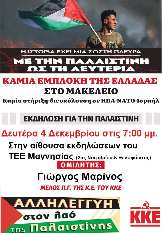 Η Τ.Ε. Μαγνησίας του ΚΚΕ διοργανώνει εκδήλωση με θέμα τις εξελίξεις στην Παλαιστίνη. Δυναμώνουμε την αλληλεγγύη στον λαό της Παλαιστίνης. Να σταματήσει τώρα το μακελειό και η σφαγή του Παλαιστινιακού Λαού. Αγωνιζόμαστε για την απεμπλοκή της χώρας μας, για να μην υπάρχει καμιά στήριξη και διευκόλυνση σε ΗΠΑ – ΝΑΤΟ – Ε.Ε.- ΙΣΡΑΗΛ