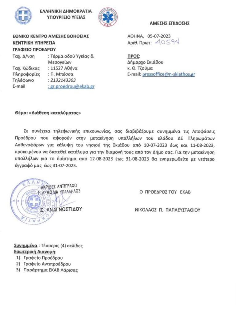 Θα ήθελα να ευχαριστήσω θερμά τον Πρόεδρο του ΕΚΑΒ κ. Νικόλαο Παπαευσταθίου για την άμεση ανταπόκριση, ο οποίος μετά την επικοινωνία που είχαμε σήμερα εξέδωσε την απόφαση της μετακίνησης των πληρωμάτων του ΕΚΑΒ. Με την ενέργεια αυτή ο Πρόεδρος του ΕΚΑΒ έλυσε άμεσα το πρόβλημα που προκλήθηκε απο την καθυστέρηση της σχετικής απόφασης από το ΕΚΑΒ της Λάρισας, τώρα μπορεί ο Δήμος να προχωρήσει άμεσα στις ενέργειες για την κάλυψη της φιλοξενίας των πληρωμάτων των ασθενοφόρων.