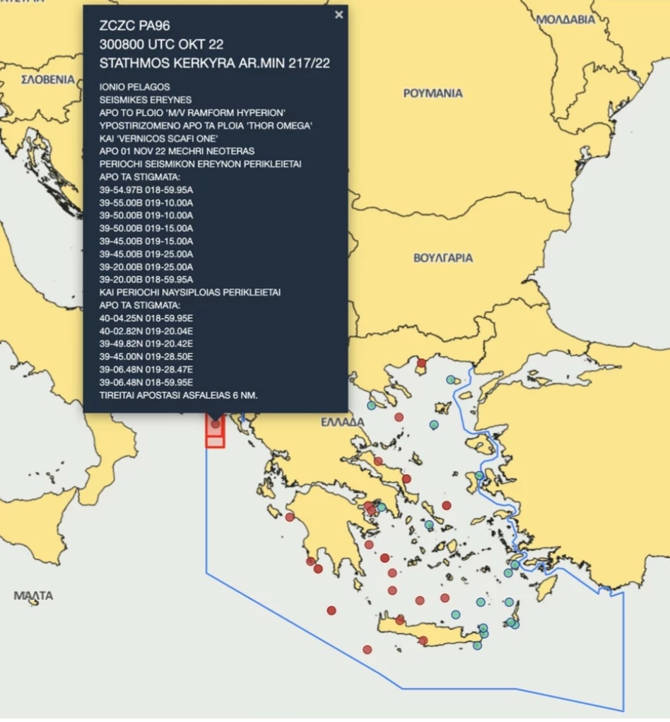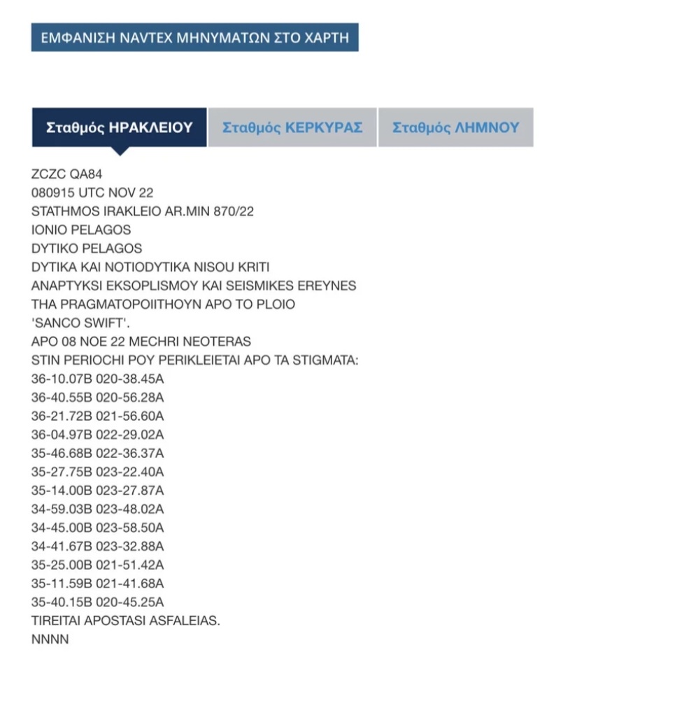 Η NAVTEX εκδόθηκε από τον σταθμό Ηρακλείου του ΠΝ. Προβλέπει ότι από σήμερα 8 Νοεμβρίου και μέχρι νεωτέρας δεσμεύονται περιοχές στο Ιόνιο Πέλαγος, στο Δυτικό Πέλαγος και δυτικά και ανατολικά της Κρήτης, προκειμένου το πλοίο «Sanco Swift» να πραγματοποιήσει ανάπτυξη εξοπλισμού και σεισμικές έρευνες.