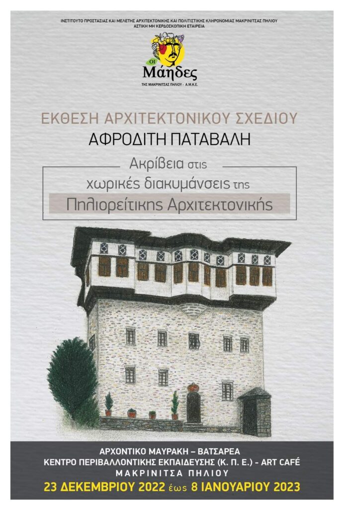 Την Παρασκευή 23 Δεκεμβρίου 2022, στις 18.00, στο «ΑΡΧΟΝΤΙΚΟ ΒΑΤΣΑΡΕΑ – ΜΑΥΡΑΚΗ» Κ. Π. Ε. ΜΑΚΡΙΝΙΤΣΑΣ – ART CAFÉ , θα εγκαινιαστεί η Έκθεση Αρχιτεκτονικού Σχεδίου της Αφροδίτης Παταβάλη με θέμα: «Ακρίβεια στις χωρικές διακυμάνσεις της Πηλιορείτικης Αρχιτεκτονικής», που θα διαρκέσει έως 8 Ιανουαρίου 2023.