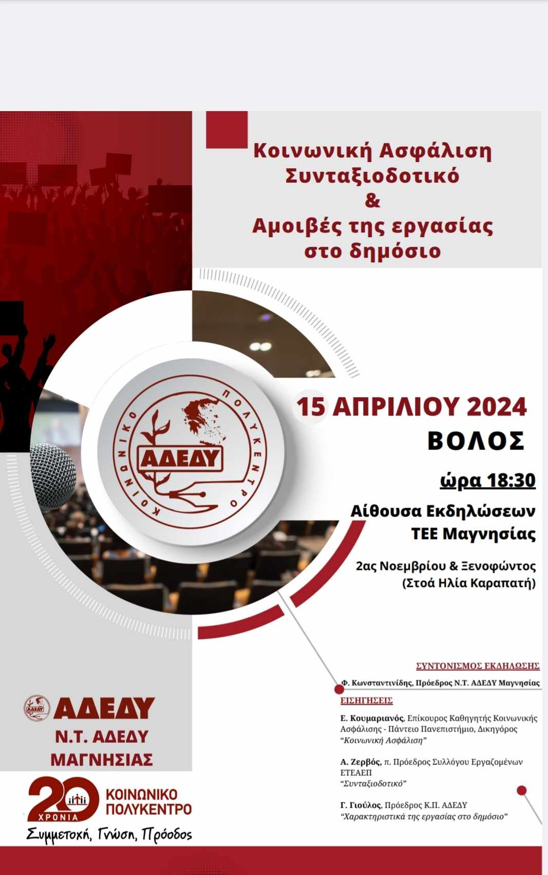 Ενημερωτική εκδήλωση θα πραγματοποιηθεί από την ΑΔΕΔΥ τη Δευτέρα 15 Απριλίου στις 18:30 μ.μ, στο ΤΕΕ Μαγνησίας (2ας Νοεμβρίου και Ξενοφώντος) σε συνεργασία με το Κοινωνικό Πολύκεντρο. Θέμα της εκδήλωσης θα είναι το Συνταξιοδοτικό, Ασφαλιστικό και το Μισθολογικό των Δημοσίων Υπαλλήλων.