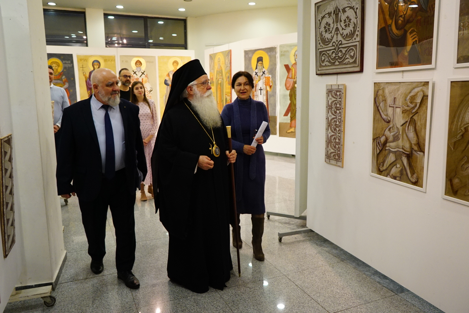 Για το περιεχόμενο της Έκθεσης μίλησε η επιμελήτριά της, Έλενα Νικηφόρου και ο φιλοξενούμενος Καθηγητής Βυζαντινής Τέχνης, Δρ. Sorica Dumitru, ο οποίος αφού ευχαρίστησε τον Σεβασμιώτατο για την φιλοξενία για Πέμπτη φορά, επισήμανε τις άριστες σχέσεις μεταξύ των δύο ομόδοξων Εθνών, την προσπάθεια που γίνεται από το Πανεπιστήμιο για την προστασία των πολιτιστικών αξιών και στον χώρο της Βυζαντινής Αγιογραφίας, έναν δρόμο που έδειξαν οι Άγιοι Πατέρες. Τέλος αναφέρθηκε με ιδιαίτερη έμφαση στην ύπαρξη άφθονων Ελληνικών απεικονίσεων σε πολλές εκκλησιές και Μοναστήρια της χώρας του, ακόμη και πορτρέτα Αρχαίων Ελλήνων φιλοσόφων. Επέδωσε δε στον Σεβασμιώτατο ως δώρο, βιβλίο με την ιστορία του ΟΡΘΟΔΟΞΟΥ ΘΕΟΛΟΓΙΚΟΥ ΠΑΝΕΠΙΣΤΗΜΙΟΥ ΒΟΥΚΟΥΡΕΣΤΙΟΥ  «ΠΑΤΡΙΑΡΧΗΣ ΙΟΥΣΤΙΝΙΑΝΟΣ».