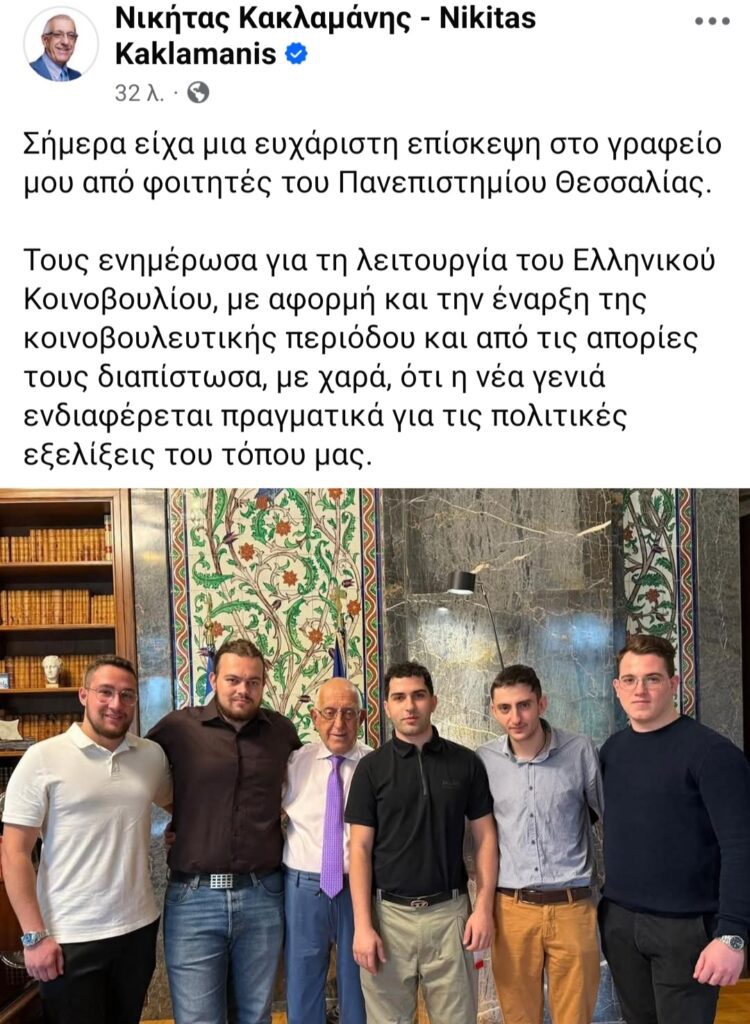 Ο Πρόεδρος της Βουλής των Ελλήνων, κ. Νικήτας Κακλαμάνης, υποδέχθηκε χθες , στο γραφείο του ομάδα φοιτητών από το Πανεπιστήμιο Θεσσαλίας.Η συνάντηση πραγματοποιήθηκε με αφορμή την έναρξη της νέας κοινοβουλευτικής περιόδου, δίνοντας την ευκαιρία στον Πρόεδρο της Βουλής να ενημερώσει τους νέους για τη λειτουργία του Ελληνικού Κοινοβουλίου, τον ρόλο του ως τον κατεξοχήν θεσμό της Δημοκρατίας, καθώς και για τις τρέχουσες πολιτικές εξελίξεις.Ο κ. Κακλαμάνης εξέφρασε την ικανοποίησή του για το έντονο ενδιαφέρον των φοιτητών:«Ήταν μια ευχάριστη και ουσιαστική επίσκεψη. Από τις απορίες και τις ερωτήσεις των φοιτητών διαπίστωσα, με ιδιαίτερη χαρά, ότι η νέα γενιά ενδιαφέρεται πραγματικά για τις πολιτικές εξελίξεις του τόπου μας. Είναι υποχρέωσή μας να κρατάμε ανοιχτές τις πόρτες του Κοινοβουλίου στους νέους, ενισχύοντας τη σύνδεση της πολιτικής ζωής με την ακαδημαϊκή κοινότητα».Στο τέλος της συνάντησης, ο κ. Κακλαμάνης φωτογραφήθηκε με τους φοιτητές, στους οποίους ευχήθηκε καλή συνέχεια στις σπουδές τους και ακαδημαϊκή πρόοδο.