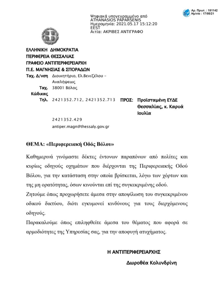Εαν η στήλη θυμάται καλά υπεύθυνος για τον καθαρισμό των χόρτων του Περιφερειακού είναι ο Δήμος Βόλου ο οποίος και πέρυσι τα έκοψε. Τώρα γιατί η επιστολή της κας Κολυνδρίνη απευθύνεται στην ΕΥΔΕ τι να σας πούμε… εκτός και εάν άλλαξε κάτι από τις αποφάσεις Γκούπα… Η επιστολή: