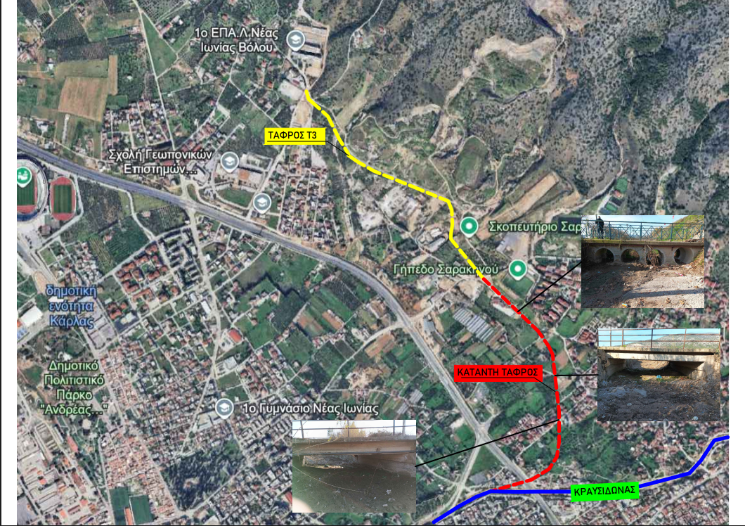 - Στην περιοχή εκτέλεσης του έργου υπάρχει το «Βαθύρεμα», τα όμβρια ύδατα του οποίου ως σήμερα είναι διαχεόμενα και κατά τις θεομηνίες Daniel & Elias προκάλεσαν σημαντικές καταστροφές στην περιοχή, με αποκορύφωμα τις ζημιές που προκλήθηκαν στο ΕΠΑΛ Νέας Ιωνίας, τις οποίες οι υπηρεσίες σας αποκατέστησαν με άλλη εργολαβία. Η Περιφέρεια Θεσσαλίας έχει ήδη εκπονήσει μελέτη οριοθέτησης με έργα διευθέτησης του «Βαθυρέματος» και βρίσκεται στη φάση της Περιβαλλοντικής αδειοδότησης. Επειδή τελικός αποδέκτης των υδάτων του «Βαθυρέματος» είναι ο «Κραυσίδωνας», μέσω της νέας τάφρου Τ3 που κατασκευάζεται αλλά και της υφιστάμενης προέκτασής της, η καλή δε λειτουργία της τάφρου σε όλο το μήκος της είναι κρίσιμης σημασίας για την αντιπλημμυρική θωράκιση της ευρύτερης περιοχής.