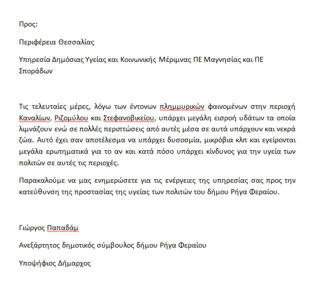 Προς τον δήμαρχο δήμου Ρήγα Φεραίου