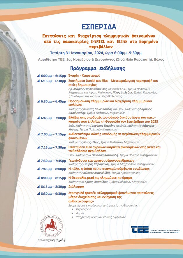 Η Πολυτεχνική Σχολή του Πανεπιστημίου Θεσσαλίας σε συνεργασία με το ΤΕΕ Μαγνησίας διοργανώνουν εσπερίδα με θέμα Επιπτώσεις και διαχείριση πλημμυρικών φαινομένων από τις κακοκαιρίες Daniel και Elias στο δομημένο περιβάλλον, την Τετάρτη 31 Ιανουαρίου από τις 6:00 μμ έως τις 9:30 μμ, στο αμφιθέατρο του ΤΕΕ, 2ας Νοεμβρίου & Ξενοφώντος (Στοά Ηλία Καραπατή) στον Βόλο.