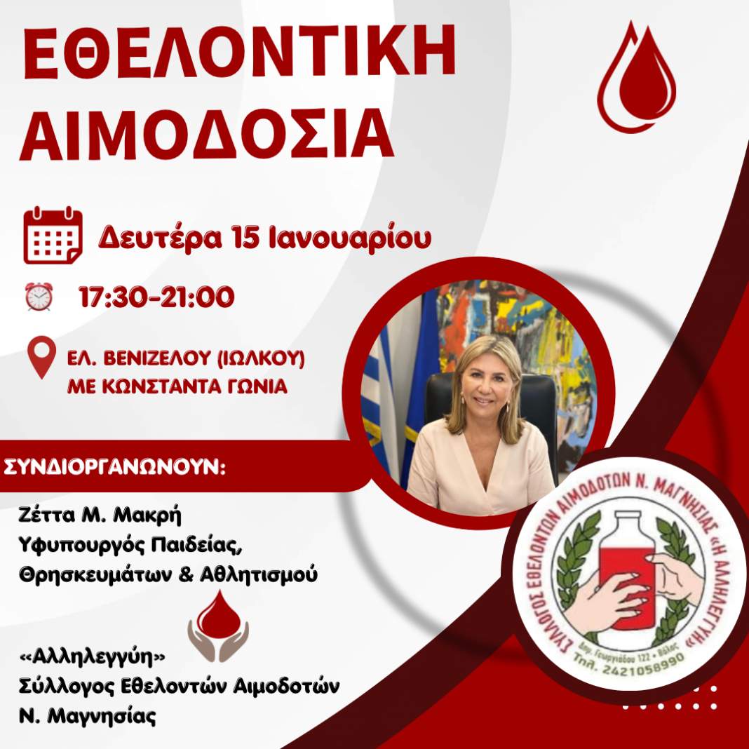 Η Υφυπουργός Παιδείας Βουλευτής Μαγνησίας της ΝΔ Ζέττα Μακρή, προσκαλεί στην 9η εθελοντική αιμοδοσία που διοργανώνει με την Αλληλεγγύη.