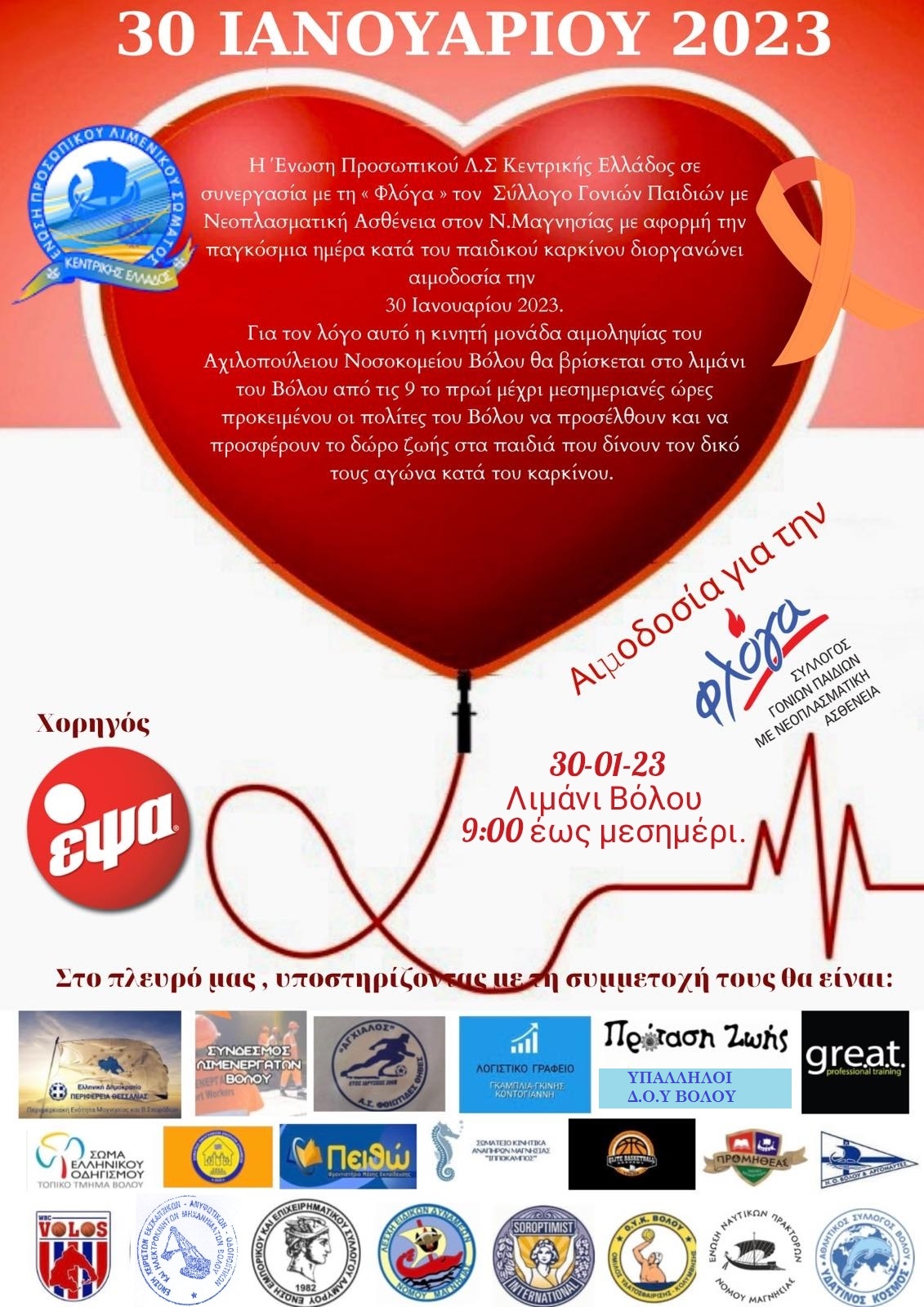 Η Ένωση Προσωπικού Λ.Σ Κεντρικής Ελλάδος σε συνεργασία με τη « Φλόγα » τον Σύλλογο Γονιών Παιδιών με Νεοπλασματική Ασθένεια στον Ν.Μαγνησίας με αφορμή την παγκόσμια ημέρα κατά του παιδικού καρκίνου διοργανώνει αιμοδοσία την 30 Ιανουαρίου 2023.