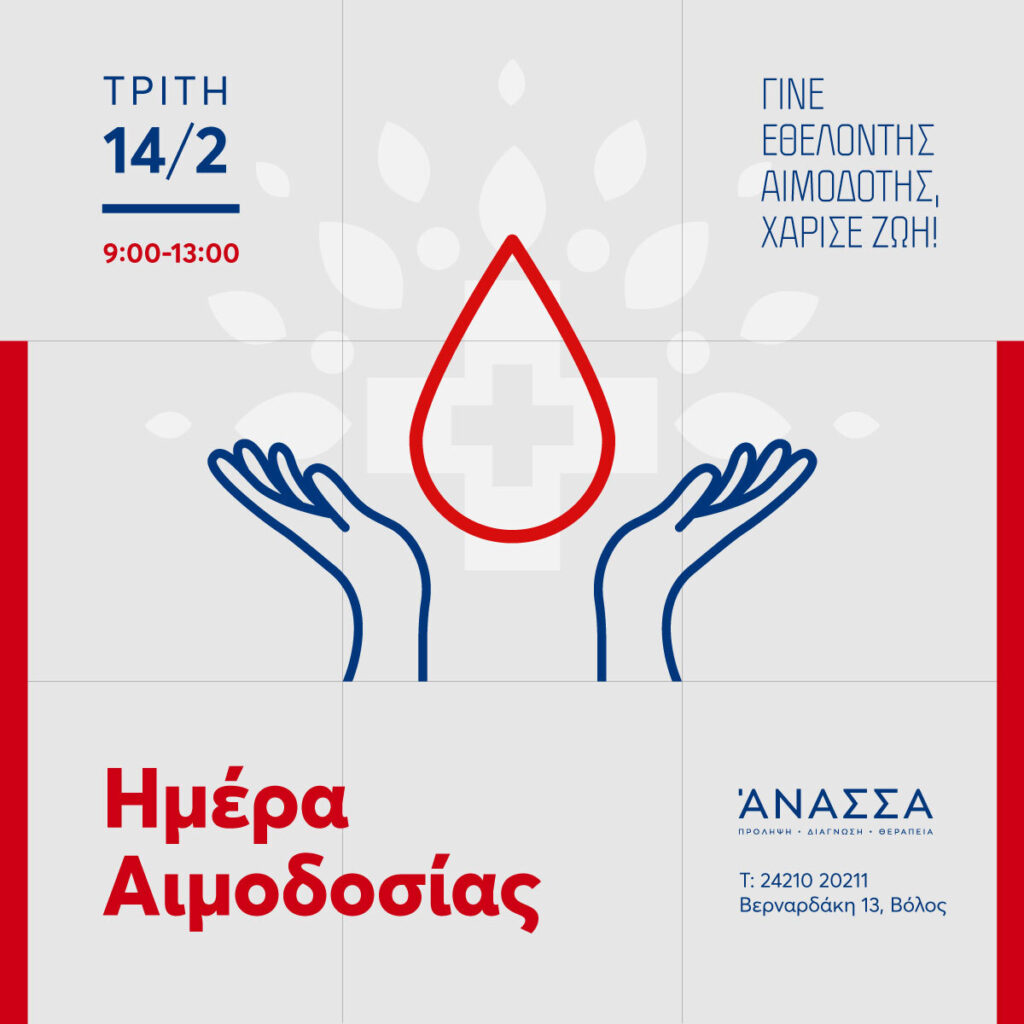 Γι’ αυτό η ΆΝΑΣΣΑ, Μέλος του Ομίλου Υγείας OneHealth, καλεί όλους τους εθελοντές αιμοδότες να συνεχίσουν να προσφέρουν αυτό το πολύτιμο δώρο ζωής προς τους συνανθρώπους μας που το έχουν ανάγκη και να συμμετέχουν στην εθελοντική αιμοδοσία που θα πραγματοποιηθεί την Τρίτη 14/2/2023 από 9.00 έως 13.00 έξω από την Κλινική ΆΝΑΣΣΑ, Βερναρδάκη 13 στον Βόλο.