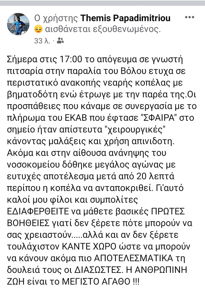 Η κοπέλα που είχε καρδιολογικό πρόβλημα στάθηκε τυχερή και αναρρώνει εκτός κινδύνου στο Νοσοκομείο.. Τι συνέβη περιέγραψε με ανάρτηση του ο εθελοντης της Λέσχης Ειδικών Δυνάμεων Θέμης Παπαδημητρίου που είναι εκπαιδευμένος στην τεχνική Κάρπα… που σώζει ζωές…