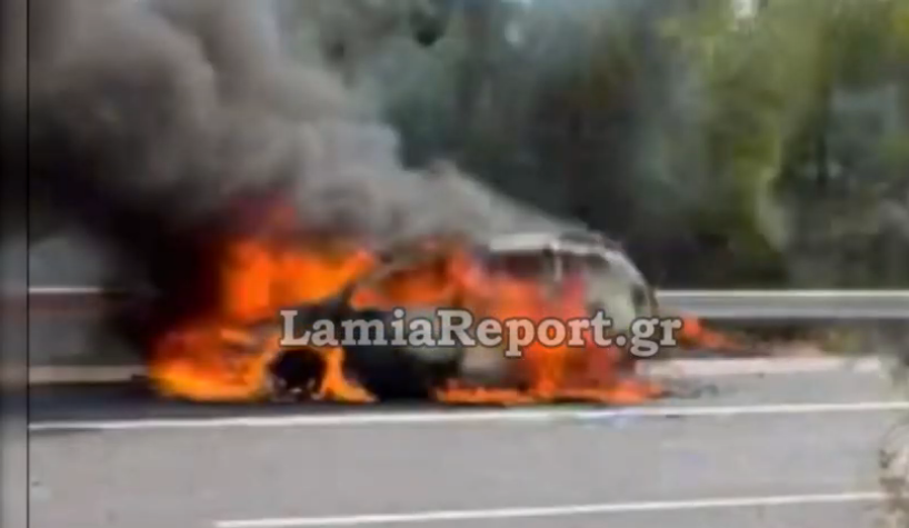 Την φωτιά στο όχημα κατέγραψε διερχόμενο ΙΧ από το αντίθετο ρεύμα κυκλοφορίας