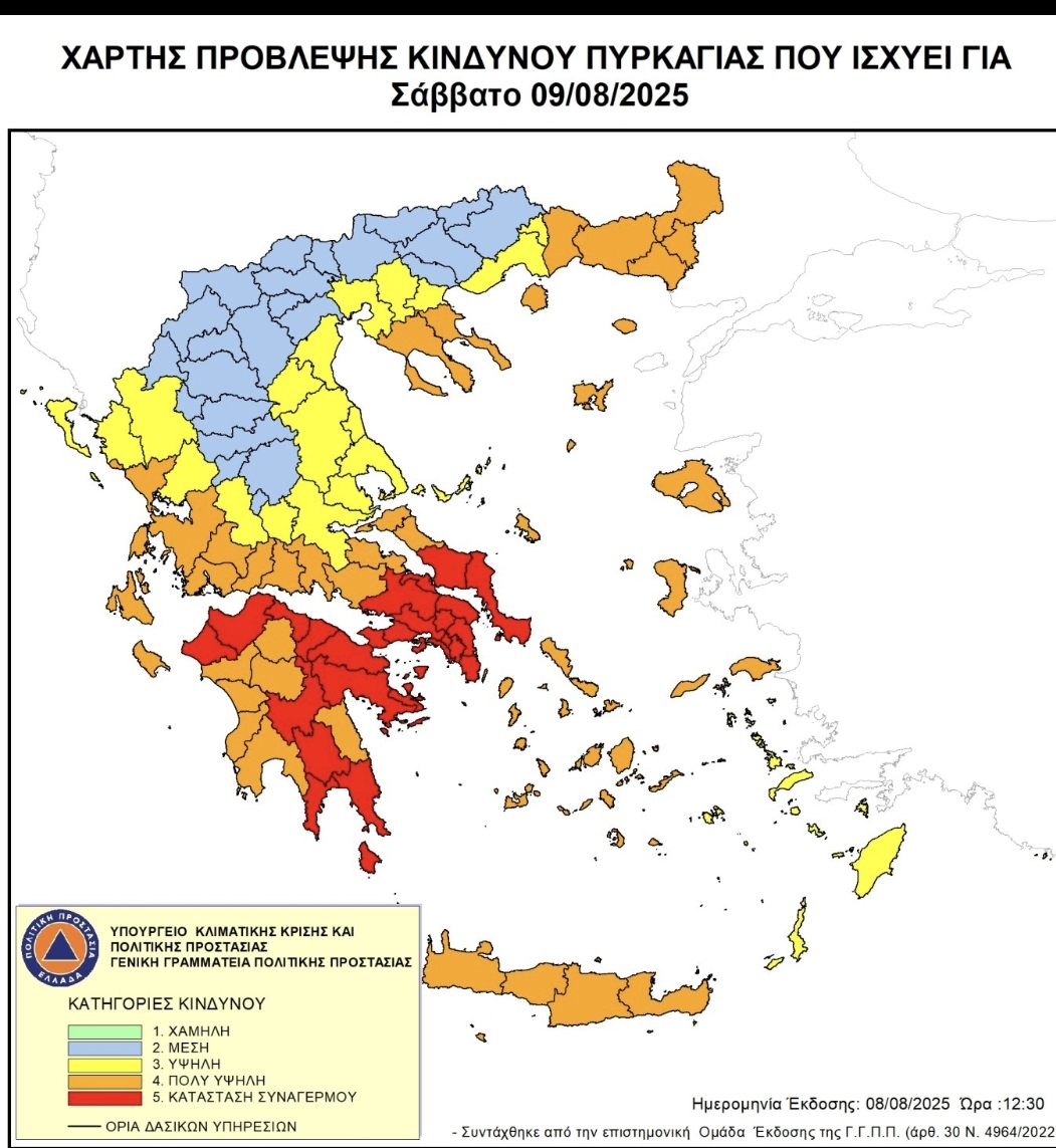 Σύμφωνα με το με αρ. 3848/08-08-2025 Δελτίο Πρόγνωσης Καιρού της ΕΜΥ/ΕΜΚ, το Σάββατο 09 Αυγούστου 2025 θα έχουμε γενικά αίθριο καιρό, με θερμοκρασία από 22 έως 35 με 36 βαθμούς Κελσίου, ενώ στις Σποράδες έως 30 με 31 βαθμούς Κελσίου. Οι άνεμοι θα είναι βόρειοι-βορειοανατολικοί 4 με 6 μποφόρ. Σύμφωνα με την Ανακοίνωση (07-08-2025) του Υπουργείου κλιματικής Κρίσης και Πολιτικής Προστασίας, το Σάββατο η ένταση των ανέμων θα φτάνει τα 7 με 8 μποφόρ, ενώ την Κυριακή τοπικά τα 7.Σύμφωνα με τις οδηγίες του ΕΣΚΕΔΙΚ και στο πλαίσιο της πρόληψης και ετοιμότητας, καλούνται όλοι οι πολίτες (Παραθεριστές και Επαγγελματίες) να επιδείξουν αυξημένη προσοχή κατά τη διάρκεια οποιασδήποτε δραστηριότητας σε θαλάσσιες και παράκτιες περιοχές, τόσο κατά τη διάρκεια εκδήλωσης των έντονων φαινομένων όσο και προληπτικά, καθώς υπάρχει αυξημένος κίνδυνος από ισχυρούς ανέμους. Οι ισχυροί άνεμοι και η πιθανότητα απότομων μεταβολών στον καιρό καθιστούν την προσοχή όλων απαραίτητη.Συστάσεις: Για Επαγγελματίες:• Ασφαλίστε άμεσα τον εξοπλισμό παραλίας (ομπρέλες, ξαπλώστρες, stand-up paddle, θαλάσσια ποδήλατα κ.λπ.)• Ενημερώστε έγκαιρα το προσωπικό για την προετοιμασία αντιμετώπισης έντονου καιρού• Επικοινωνήστε με τους πελάτες σας για πιθανές αλλαγές στη λειτουργία ή περιορισμούςΓια τους Παραθεριστές:• Μείνετε ενημερωμένοι μέσω έγκυρων πηγών (EMY, meteoalarm, Πολιτική Προστασία)• Κατά τις ώρες εκδήλωσης των φαινομένων, προτιμήστε την παραμονή σε προστατευμένους χώρους• Αν σκοπεύετε να βρεθείτε στη θάλασσα, συμβουλευτείτε πρώτα τους τοπικούς επαγγελματίες ή ναυαγοσώστες για τυχόν συστάσειςΓια περισσότερες πληροφορίες, οδηγίες αυτοπροστασίας και συνεχή ενημέρωση οι πολίτες μπορούν να επισκεφθούν την ιστοσελίδα της Γενικής Γραμματείας Πολιτικής Προστασίας στην ηλεκτρονική διεύθυνση www.civilprotection.gr.Η Περιφέρεια Θεσσαλίας ενημερώνει ότι σύμφωνα με απόφαση της Γενικής Γραμματείας Πολιτικής Προστασίας σήμερα Παρασκευή (08-08-25), η ΠΕ Μαγνησίας & Σποράδων είναι σε κατάσταση κινητοποίησης (Red Code). Όπως προβλέπεται με τον Ημερήσιο Χάρτη Πρόβλεψης Κινδύνου Πυρκαγιάς της Γενικής Γραμματείας Πολιτικής Προστασίας, για το Σάββατο 09 Αυγούστου 2025, προβλέπεται Κατηγορία Κινδύνου 3 (υψηλή) για την Π.Ε. Λάρισας και για τις Π.Ε. Μαγνησίας & Σποράδων. Στο πλαίσιο αυτό, έχουν τεθεί σε αυξημένη ετοιμότητα και επιφυλακή όλες οι αρμόδιες υπηρεσίες και φορείς της Περιφέρειας, σε συνεργασία με το Πυροσβεστικό Σώμα, για την πρόληψη και άμεση αντιμετώπιση πιθανών πυρκαγιών, αλλά και για την ενημέρωση του κοινού και για τη λήψη των αναγκαίων μέτρων.Με σκοπό την αποτροπή εκδήλωσης πυρκαγιών στην ύπαιθρο τονίζεται ότι: • Απαγορεύεται η καύση υπολειμμάτων φυτικής βλάστησης (κλαδεμάτων, υπολειμμάτων καλλιέργειας, ξηρών χόρτων κτλ.), απορριμμάτων και εν γένει η χρήση φωτιάς στην ύπαιθρο ανεξαρτήτου δείκτη επικινδυνότητας. • Απαγορεύονται οι θερμές εργασίες όταν ο δείκτης επικινδυνότητας είναι κατηγορίας 4 (πολύ υψηλή) ή 5 (κατάσταση συναγερμού), καθώς και τις λοιπές ημέρες χωρίς την τήρηση των προβλεπόμενων προληπτικών μέτρων, όρων και προϋποθέσεων. Ως θερμές εργασίες νοούνται οι εργασίες που παράγουν σπινθήρες ή περιλαμβάνουν γυμνή φλόγα/θερμότητα, όπως ηλεκτροσυγκόλληση, οξυγονοκόλληση, κοπή, λείανση, χρήση φλόγας ή ηλεκτρικού τόξου, καθώς και χρήση εξοπλισμού που προκαλεί θερμότητα, φλόγα ή σπινθήρα. • Απαγορεύεται 