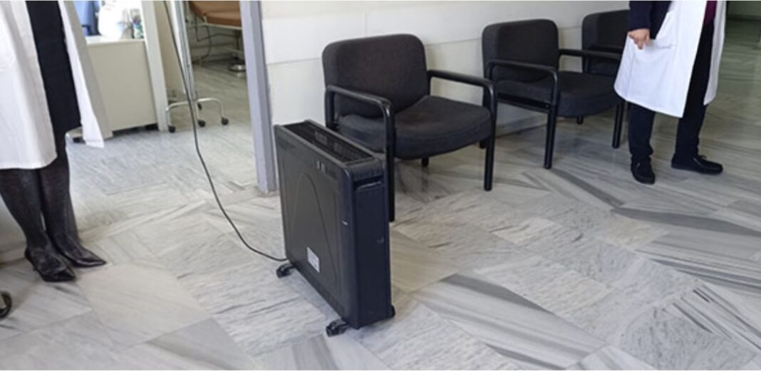 Για να ζεσταίνονται κατ’ ελάχιστο οι χώροι γιατροί και νοσηλευτές φέρνουν από τα σπίτια τους επιδαπέδια αερόθερμα. Επίσης, ένα καλοριφέρ που αγόρασαν με δικά τους χρήματα οι υπάλληλοι επιστρατεύεται κάθε μέρα για να ζεσταίνονται οι διάδρομοι, που είναι «μπούζι».