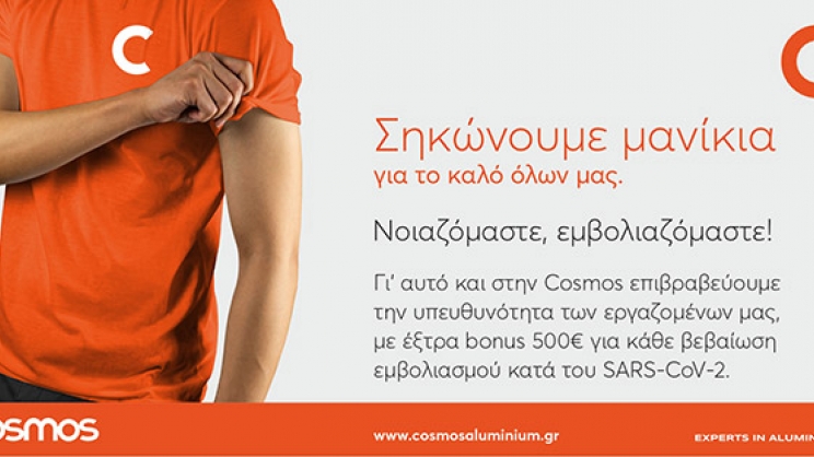 ευαισθησία αλλά και την ατομική υπευθυνότητα των εργαζομένων της και σε άμεση προσαρμογή με τις κυβερνητικές εξαγγελίες, αποφάσισε να παρέχει έξτρα bonus εμβολιασμού αξίας €500 για κάθε εργαζόμενό της που ολοκληρώνει τη διαδικασία εμβολιασμού του, παρέχοντας το επίσημο πιστοποιητικό. Όπως αναφέρει σε ανακοίνωσή το Διοικητικό Συμβούλιο της COSMOS Aluminium AE, «το μέτρο αυτό θα συνοδεύεται με εκτεταμένη καμπάνια σε μέσα επικοινωνίας αλλά και στο εσωτερικό δίκτυο πληροφόρησης της εταιρείας με προτροπές και υποκινήσεις προς τους εργαζομένους να προβούν σε εμβολιασμό κατά του SARS – CoV – 2 «…για το καλό όλων μας». Το μέτρο αυτό του έκτακτου Bonus δεν είναι καθόλου ξένο στους εργαζομένους της COSMOS, καθώς η διοίκηση της εταιρείας πολλές φορές έχει χρησιμοποιήσει αυτόν τον τρόπο επιβράβευσης και παρακίνησης όπως π.χ. πέρυσι για την προσαρμοστικότητα των εργαζομένων στα νέα μέτρα ασφαλείας μοίρασε έκτακτο bonus που έφτανε τα € 2.000. Και όλα αυτά συμπληρωματικά στα ετήσια bonus αποτελεσμάτων που συνήθως ξεκινούν από έναν επιπλέον μισθό (15ο) και φτάνουν με ειδικά συμπληρωματικά bonus στα επίπεδα αρκετών χιλιάδων ευρώ για κάθε εργαζόμενο. Η COSMOS Aluminium AE είναι πρότυπη εταιρεία διέλασης αλουμινίου με έδρα τη Λάρισα και σήμερα απασχολεί 180 εργαζόμενους με προοπτική το καλοκαίρι του 2022 να μισθοδοτεί περισσότερους από 220!».