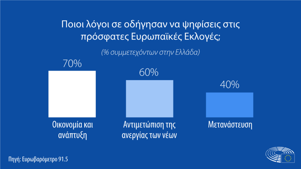 Τα αποτελέσματα δείχνουν ότι οι ψηφοφόροι στις Ευρωπαϊκές Εκλογές 2019 παρακινήθηκαν επίσης από το αίσθημα δημοκρατικού καθήκοντός τους, την ολοένα και ισχυρότερη πεποίθηση ότι η ψήφος τους μπορεί να αλλάξει τα πράγματα, καθώς και την αυξημένη στήριξή τους για την ΕΕ. Κατά μέσο όρο (σε επίπεδο ΕΕ) η έρευνα καταδεικνύει την οικονομία και την ανάπτυξη (44%) και την κλιματική αλλαγή (37%) ως τις κύριες παράμετροι τις αποφάσεις των ψηφοφόρων. Σημαντικό ρόλο έπαιξαν επίσης τα ανθρώπινα δικαιώματα και η δημοκρατία (37%), ο τρόπος που η ΕΕ θα πρέπει να λειτουργεί στο μέλλον (36%) και η μετανάστευση (34%). Αν και η οικονομία ήταν το πιο σημαντικό θέμα για τους ψηφοφόρους σε 16 κράτη μέλη, η κλιματική αλλαγή βρέθηκε στην κορυφή της λίστας των προτεραιοτήτων σε οκτώ συνολικά χώρες.