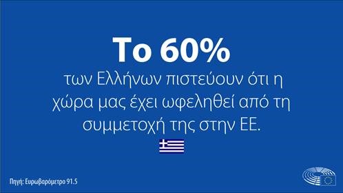 Πάνω από τα δύο τρίτα των ερωτηθέντων (68%) συνολικά στις 28 χώρες της ΕΕ πιστεύουν ότι η χώρα τους έχει ωφεληθεί από τη συμμετοχή της στην ΕΕ, αριθμός ο οποίος δεν είχε καταγραφεί από το 1983. Περισσότεροι από τους μισούς Ευρωπαίους (56%) συμφωνούν επίσης ότι η φωνή τους «μετράει» στην ΕΕ, ποσοστό που παρουσιάζει αύξηση επτά μονάδων σε σύγκριση με το διάστημα Φεβρουάριος – Μάρτιος 2019, ενώ αποτελεί και το θετικότερο αποτέλεσμα για το συγκεκριμένο δείκτη από το 2002.