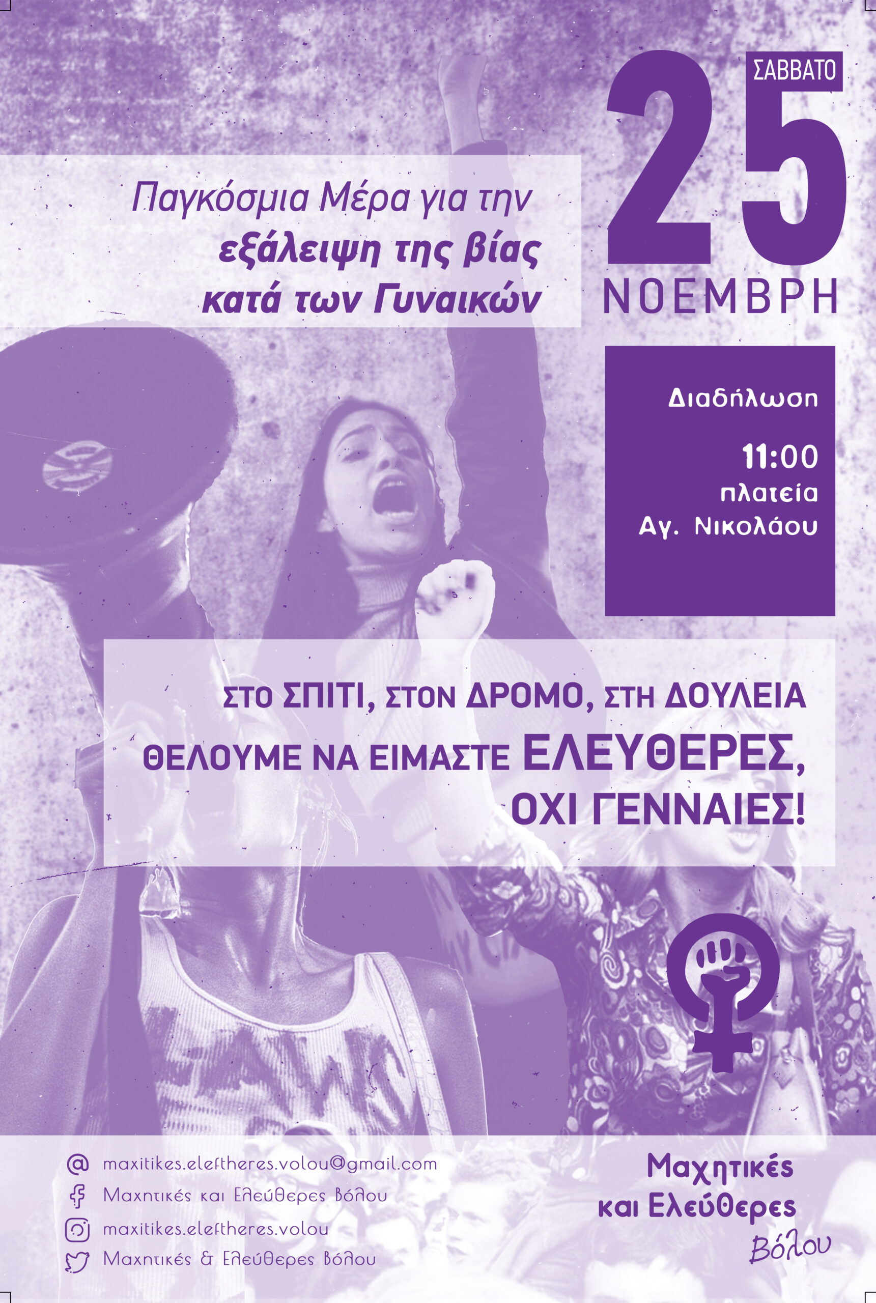 Τα περιστατικά έμφυλης βίας στην περιοχή του Βόλου/Μαγνησίας και της Θεσσαλίας είναι πάρα πολλά και σοβαρά. Τον Ιούλιο, Βολιώτης «διεθνής αθλητής» χτύπησε την πρώην σύζυγό του, μπροστά στο ανήλικο παιδί τους και την έστειλε στο νοσοκομείο με σπασμένη μύτη. Στη συνέχεια της έκανε μήνυση και η κακοποιημένη κρατήθηκε στο αστυνομικό τμήμα λόγω της αντιμήνυσης του κακοποιητή! Τον Σεπτέμβριο έγινε γνωστό το μαρτύριο που περνούσε γυναίκα και το παιδί της στις Αλυκές. Ο κακοποιητής κρατούσε φυλακισμένη τη γυναίκα και το παιδί μέσα στο σπίτι και την χτυπούσε βάναυσα. Η γυναίκα κατάφερε να σωθεί όταν οι γείτονες αντέδρασαν στις εκκλήσεις για βοήθεια, έσωσαν τη γυναίκα και ακινητοποίησαν το δράστη.
