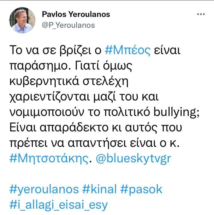 Να απολογηθεί ο Κ. Μητσοτάκης για τον Α. Μπέο, που καλύπτει τις συμπεριφορές του δημάρχου Βόλου και τα κυβερνητικά στελέχη που χαριεντίζονται μαζί του , ζητάει ο διεκδικητής της ηγεσίας του ΠΑΣΟΚ και πρώην υπουργός κ. Παύλος Γερουλάνος, μερα τις υβριστικές αναρτήσεις του Δημάρχου Βόλου εις βάρος του Γιώργου Παπανδρέου. Η ανάρτηση του κ. Γερουλάνου ηρθε μετά και την είχε τη δήλωση του Παναγιώτη Βλάχου υπεύθυνου επικοινωνίας του ΚΙΝΑΛ και στενού συνεργάτη του Νίκου Ανδρουλάκη.