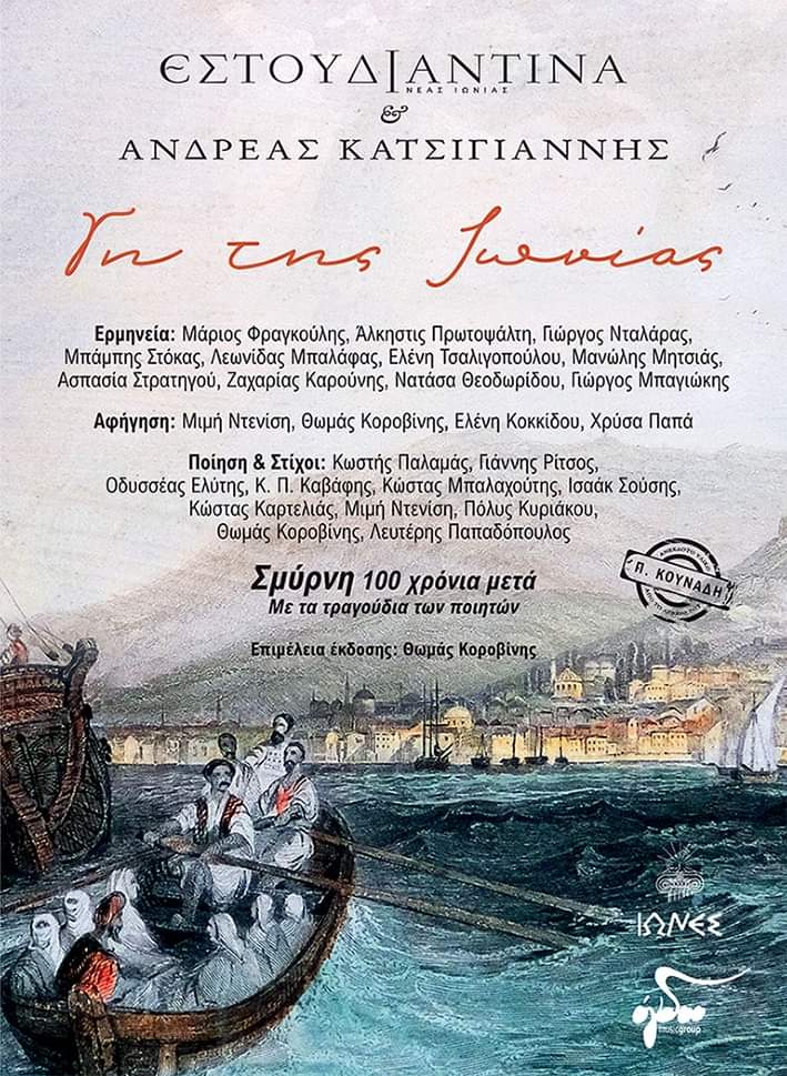 Στο πρώτο μέρος της συναυλίας της Εστουδιαντίνας Νέας Ιωνίας , που θα πραγματοποιηθεί στις 29 Αυγούστου στο θεατράκι της Αρχιτεκτονικής Σχολής Βόλου ,θα παρουσιαστεί μέρος αυτού του μοναδικού έργου με τίτλο ‘’Γη της Ιωνίας’’, του οποίου τη μουσική και τη διεύθυνση παραγωγής υπογράφει ο συνθέτης Ανδρέας Κατσιγιάννης σε συνεργασία με την περίφημη Εστουδιαντίνα Ν.Ιωνίας . Αποσπάσματα από τα κείμενα του έργου θα διαβάσει η σκηνοθέτρια, ηθοποιός και σεναριογράφος Μιμή Ντενίση.