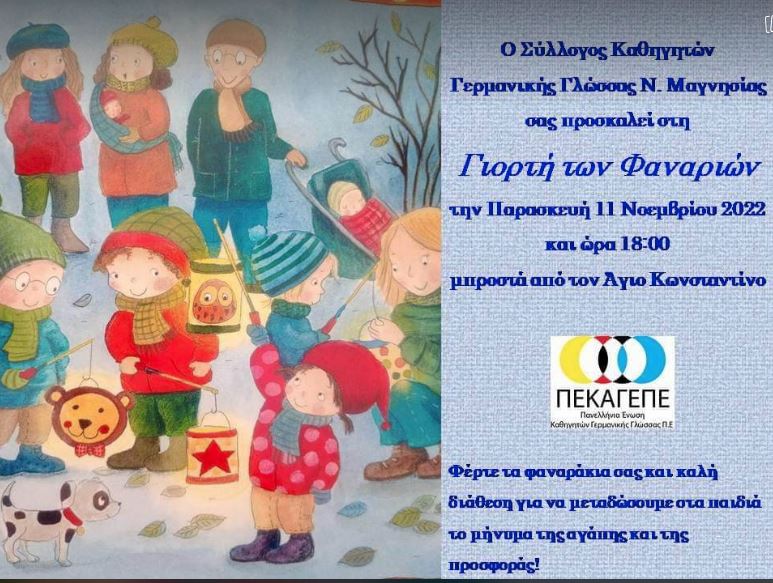 Ο Σύλλογος καθηγητών Γερμανικής Γλώσσας Νομού Μαγνησίας, προσκαλεί στη γιορτή των φαναριών την Παρασκευή 11 Νοεμβρίου και ώρα 18.00 μπροστά στον Αγ., Κωνσταντίνο.