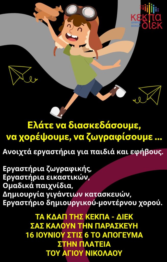Την Παρασκευή 16 Ιουνίου 2023 από τις 18:00 έως τις 21:00 το βράδυ τα 5 ΚΕΝΤΡΑ ΔΗΜΙΟΥΡΓΙΚΗΣ ΑΠΑΣΧΟΛΗΣΗΣ ΠΑΙΔΙΩΝ και το Ι.Ι.Ε.Κ. της ΚΕΚΠΑ-ΔΙΕΚ του Δήμου Βόλου θα βρίσκονται στον αύλειο χώρο του Αγίου Νικολάου στο Βόλο.Σκοπός της δράσης αυτής είναι με βιωματικό τρόπο να γνωρίσουν γονείς και παιδιά τις δομές της ΚΕΚΠΑ, να ενημερωθούν για τις δράσεις των ΚΔΑΠ και τον εικαστικό τους προσανατολισμό αλλά και να ενημερωθούν οι ενδιαφερόμενοι για το θεσμό του Ι.Ι.Ε.Κ και τις Υπηρεσίες που οι δομές της ΚΕΚΠΑ- ΔΙΕΚ προσφέρουν.
