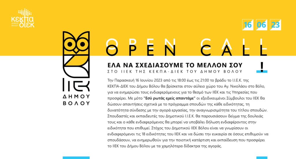 Με μότο «Εσύ ρωτάς εμείς απαντάμε» οι εξειδικευμένοι Σύμβουλοι του ΙΙΕΚ θα δώσουν απαντήσεις σχετικά με το πρόγραμμα σπουδών της κάθε ειδικότητας, τη δυνατότητα σύνδεσης με την αγορά εργασίας, την αναγνωρισιμότητα του τίτλου σπουδών. Σπουδαστές και εκπαιδευτές του Δημοτικού Ι.Ι.Ε.Κ. θα παρουσιάσουν δείγμα της δουλειάς τους και ο κάθε ενδιαφερόμενος θα μπορεί να υποβάλει δήλωση ενδιαφέροντος στην ειδικότητα που επιθυμεί. Στόχος του Δημοτικού ΙΙΕΚ Βόλου είναι να γνωρίσουν οι ενδιαφερόμενοι τις 18 ειδικότητες του ΙΙΕΚ και να δώσει την ευκαιρία σε όσους επιθυμούν να σπουδάσουν, να ενημερωθούν για την ποιοτική κατάρτιση και εκπαίδευση που προσφέρει το ΙΙΕΚ του Δήμου Βόλου με τα χαμηλότερα δίδακτρα της αγοράς.