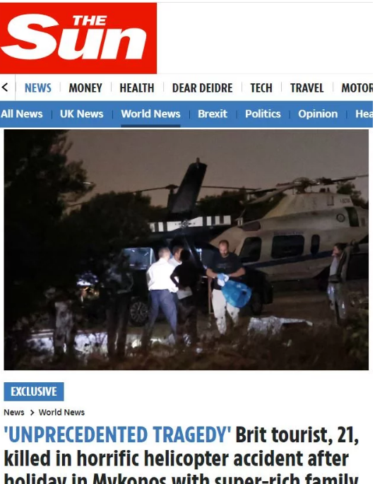 «Βρετανός τουρίστας, 21 ετών, σκοτώθηκε σε φρικιαστικό δυστύχημα με ελικόπτερο μετά από διακοπές στη Μύκονο με την πλούσια οικογένειά του», είναι ο τίτλος του δημοσιεύματος για το θέμα, το οποίο λαμβάνει ολοένα και μεγαλύτερη έκταση.
