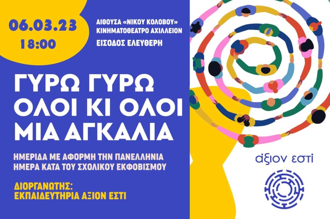Τα Εκπαιδευτήρια Άξιον Εστί διοργανώνουν ημερίδα- συζήτηση για όλους τους γονείς και τους εκπαιδευτικούς υπέρ του σεβασμού και της συνεργασίας των μαθητών στα σχολεία με τίτλο «γύρω γύρω όλοι κι όλοι μια αγκαλιά», με αφορμή την Πανελλήνια Ημέρα κατά του σχολικού εκφοβισμού. Η εκδήλωση θα πραγματοποιηθεί την Δευτέρα 6 Μαρτίου στις 6 μ.μ. στην αίθουσα «Νίκου Κολοβού» του Κινηματοθέατρου Αχίλλειον.