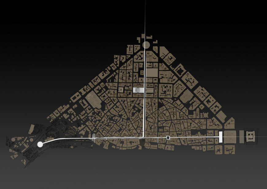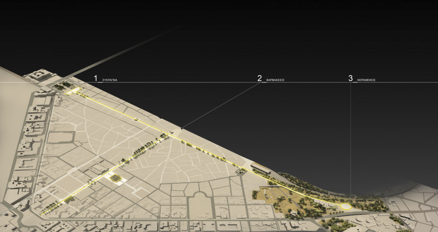 Βρίσκεται κυρίως στη σχέση του με την Ακρόπολη των Αθηνών μέσω της κάθετης συσχέτισής της με την οδό Αθηνάς, την άλλοτε πανίσχυρη διχοτόμο του -τη γραμμική καρδιά της πόλης. Είναι η πυρετώδης αυτή, οικονομική, εμπορική και πολιτιστική φλέβα που διοχετευόμενη στην εφαπτομενική στον βράχο οδό Ερμού οφείλει να αποτελεί μαζί της ένα ισχυρό Τ, όχι απλώς κινήσεων -αλλά ανανεωμένης, έντονης, πολύπλοκης μητροπολιτικής ζωής. Κατά την αναγέννηση του Ιστορικού Τριγώνου η ανάκτηση του δημόσιου χώρου πλέον επιβάλλεται -και δεν μπορεί παρά να διασυνδεθεί ως στρατηγική με τα εγγενή εσωτερικά του χαρακτηριστικά, με την ανάκτηση της λάμψης του ενδότερου, γραμμικού αυτού Τ: ανάμεσα στην Ομόνοια και την Ακρόπολη, ανάμεσα στο Σύνταγμα και τον Κεραμεικό. Η πρόταση ανάπλασης του Κέντρου της Αθήνας συνίσταται στη λειτουργική, γεωμετρική, και πολιτισμική ισχυροποίηση της εσωτερικής δομής του Ιστορικού Τριγώνου, μέσω της δημιουργίας τριών νέων πόλων έντασης: δύο στα άκρα της υποτείνουσας Ερμού -στο Σύνταγμα και τον Κεραμεικό- και ενός στο μέσον της διχοτόμου Αθηνάς -στη Βαρβάκειο Αγορά.