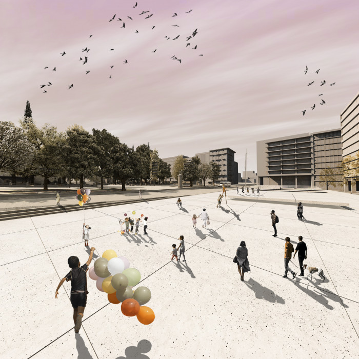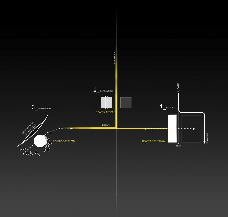 Νέα πλατεία πολιτισμού στο Σύνταγμα Νέα πλατεία πολιτισμού στο Σύνταγμα Τρεις ανασχεδιασμένοι πόλοι ισχυροποιούν τον χαρακτήρα των δημόσιων χώρων που τους γεννούν: Πλατεία Πολιτισμού στο Σύνταγμα, Πλατεία Αγοράς στην Βαρβάκειο, Πλατεία Αναψυχής στον Κεραμεικό. Ορθογώνιο, Τετράγωνο, Κύκλος: 3 απλές νέες γεωμετρίες, συνοδευόμενες από καίριες κυκλοφοριακές, λειτουργικές και γεωμετρικές ρυθμίσεις επιχειρούν μαζί με μία αναδιάρθρωση του πλέγματος των κινήσεων πεζών, την ανάκτηση του δημόσιου χώρου, την επανενεργοποίηση των αξόνων Αθηνάς-Ερμού, την ενίσχυση της εσωτερικής ζωής του αθηναϊκού Τριγώνου.