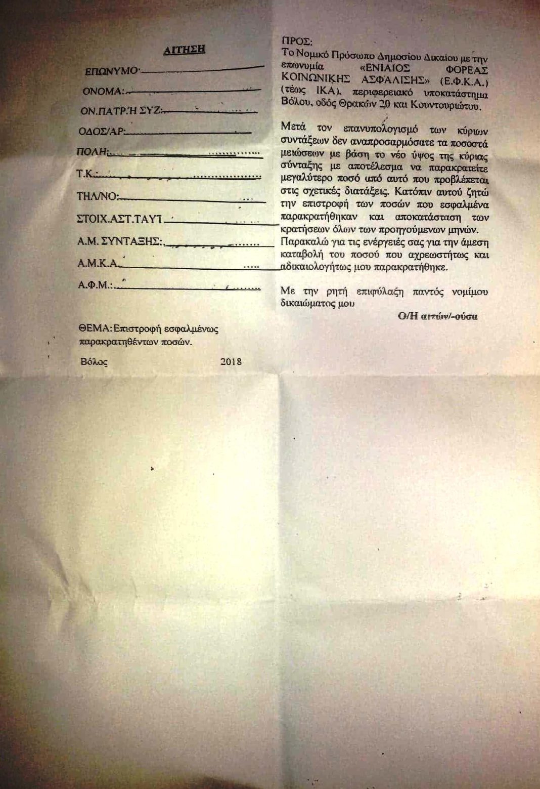Αυτό είναι το χαρτί της αίτησης που πρέπει να συμπληρώσουν οι συνταξιούχοι στον ΕΦΚΑ εφ’ όσον δεν καταθέτουν αγωγή για τις μειώσεις που υπέστησαν στις συντάξεις και στα δώρα τους. Περισσότεροι από 3 χιλιάδες έχουν ήδη καταθέσει στον ΕΦΚΑ του Βόλου την εν λόγω αίτηση μέσα στις  τρεις πρώτες ημέρες από την έκδοση της απόφασης στη Θεσσαλονίκη υπέρ συνταξιούχου που δικαιώθηκε.