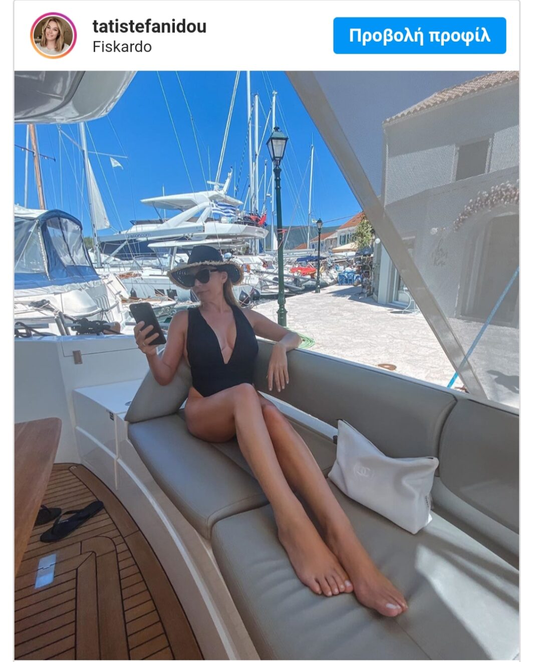 Η παρουσιάστρια μαζί με την οικογένειά της κάνουν τις διακοπές τους στο Ιόνιο, από όπου μοιράζεται αρκετά στιγμιότυπα με τους ακολούθους της στο Instagram. Εντυπωσιακή ήταν η φωτογραφία που τράβηξε η ίδια την όμορφη κόρη της Λυδία, άκρως εντυπωσιακή ήταν και μια φωτογραφία της ίδια. Σαν σταρ του σινεμά, ποζάρει με ένα υπέροχο σέξι μαύρο ολόσωμο μαγιό που αναδεικνύει το κορμί της και τα εντυπωσιακά της πόδια, μέσα σε σκάφος στο Φισκάρδο.