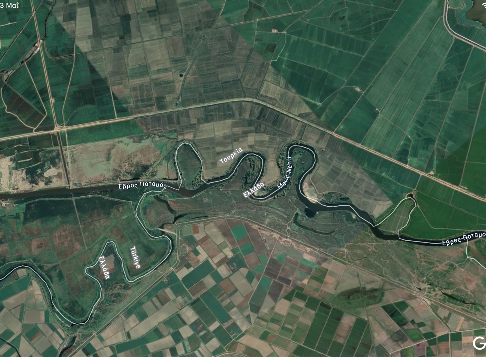 Το 1955 έγινε η ευθυγράμμιση του ποταμού στο νότιο τμήμα του, από την περιοχή των Φερών μέχρι το Δέλτα του ποταμού. Δημιουργήθηκε έτσι μια ευθύγραμμη κοίτη και καταργήθηκαν οι «μαίανδροι» της παλιάς κοίτης. Τα σύνορα όμως δεν άλλαξαν. Έτσι δημιουργήθηκαν εδάφη που βρίσκονταν εκατέρωθεν της νέας κοίτης και αποκόπηκαν από το έδαφος της χώρας προέλευσης.