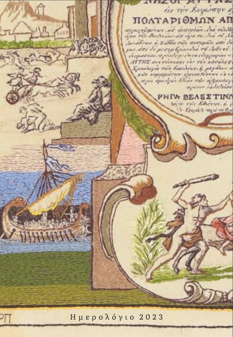 Με την πίστη ότι η κεντητική είναι μια πρωτότυπη μορφή τέχνης, από τους πλουσιότερους κλάδους της λαϊκής χειροτεχνίας, παραδίδουμε τον απέριττο αυτό ημεροδείκτη, με τα δώδεκα φύλλα της Χάρτας-ισάριθμα κεντήματα, που στην περίπτωσή μας αντιπροσωπεύουν τους δώδεκα μήνες του χρόνου που ανατέλλει. Ξεφυλλίστε τον και ταξιδέψτε μαζί του από τον τόπο μας, τη Μαγνησία με τα τοπωνύμια της εποχής και από το τοπογραφικό διάγραμμα του Βελεστίνου, το οποίο ο Ρήγας έθεσε σε εμφανή θέση, τονίζοντας την ιστορία της γενέτειράς του, σε ολόκληρη την Ελλάδα· και ακόμα παραπέρα: από τα Καρπάθια και το Δούναβη ως την Κρήτη. Και από την Αδριατική και το Ιόνιο ως τον Εύξεινο Πόντο και τη Βιθυνία της Μικράς Ασίας. Περιηγηθείτε στο χώρο της Μεσογείου, όπου καταχωρείται σε μεγάλη κλίμακα η Κωνσταντινούπολη και τα τοπογραφικά διαγράμματα ιερών τόπων και γεγονότων από την αρχαία Ελλάδα, όπως της Ολυμπίας, των Δελφών, των Θερμοπυλών, της Σπάρτης, της Αθήνας, της μάχης των Πλαταιών, της ναυμαχίας της Σαλαμίνος. Χαρείτε το σχεδίασμα της μυθολογικής «Αργώ», σε περίοπτη θέση της προμετωπίδας της Χάρτας κάτω αριστερά (φύλλο 4-Απρίλιος 2023), δίπλα στην αλληγορική παράσταση τον Ηρακλή που με υψωμένο το ρόπαλό του (σύμβολο της ελληνικής ανδρείας) κυνηγά την έφιππη Αμαζόνα.