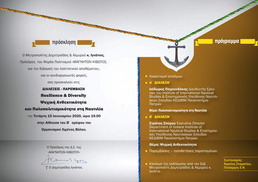 Εκδήλωση για τη Ψυχική Ανθεκτικότητα και Πολυπολιτισμικότητα στη Ναυτιλία πραγματοποιήθηκε σήμερα το απόγευμα στην Αίθουσα του Β΄ ορόφου του Οργανισμού Λιμένος Βόλου. Πρόκειται για μία ακόμη σημαντική εκδήλωση που διοργάνωσε ο φορέας Πολιτισμού της Ιεράς Μητρόπολης Δημητριάδος & Αλμυρού, «Μαγνήτων Κιβωτός, για τη διάσωση του πολιτιστικού αποθέματος», με την συνεργασία Πανεπιστημίων και φορέων που ασχολούνται με την εκπαίδευση πάνω σε γενικότερα ζητήματα ναυτιλίας. Θα ακουστούν οι Διαλέξεις επάνω στα πολύ σημαντικά νέα ζητήματα της ναυτιλίας μας,