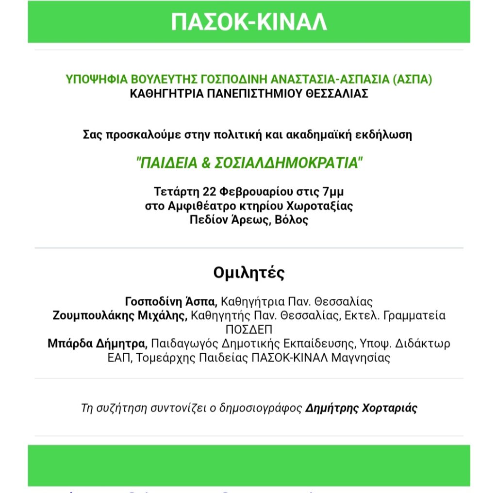 Μια πολύ ενδιαφέρουσα εκδήλωση για την παιδεία και την Σοσιαλδημοκρατία λαμβάνει χώρα στο αμφιθέατρο του τμήματος Χωροταξίας του Πανεπιστημίου Θεσσαλίας με πρωτοβουλία της υποψήφιας βουλευτού του ΠΑΣΟΚ καθηγήτριας Χωροταξίας και Άσπας Γοσποδίνη.