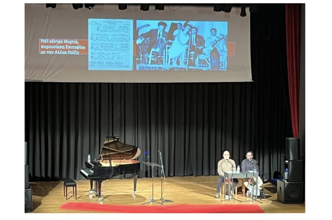 Ιδιαίτερη συγκίνηση προσέφεραν στο κοινό για μιάμιση ώρα περίπου, η Ιωάννα Φόρτη με τις θαυμάσιες ερμηνείες της, αγαπημένων τραγουδιών του Μίκη Θεοδωράκη και ο Αχιλλέας Γουάστωρ που την συνόδευσε στο πιάνο. Ξεκίνησαν με την «Ειρήνη», σε ποίηση Β. Ρώτα, από τα Παιδικά τραγούδια, τα πρώτα έργα του έφηβου Μίκη Θεοδωράκη, «Ο κήπος έμπαινε στη θάλασσα» και «Μαρίνα» από τις Μικρές Κυκλάδες του Οδ. Ελύτη, «Πού πέταξε τ΄αγόρι μου» από τον Επιτάφιο του Γ. Ρίτσου, και Εις Σάμον, του Αν. Κάλβου από το έργο ΑΡΚΑΔΙΑ IV. Ακολούθησαν δύο καινούργια ανέκδοτα τραγούδια σε επεξεργασία – ενορχήστρωση Αχιλλέα Γουάστωρ, «Η μητέρα του εξόριστου» του Κώστα Καλαντζή και «Το περιστέρι», τραγούδι που ο Μίκης Θεοδωράκης έγραψε όταν ήταν εξόριστος στη Ζάτουνα σε στίχους του φρουρού του, Σπύρου Ασημακόπουλου. Και τα δύο περιλαμβάνονται στο έργο ΑΡΚΑΔΙΑ IX. Η Ιωάννα Φόρτη διηγήθηκε τις ιδιαίτερες ιστορίες τους, πρόκειται για έργα που είχαν μείνει ξεχασμένα για πολλές δεκαετίες. Ηχογραφήθηκαν μαζί με άλλα τρία τον περασμένο Ιούλιο και στον Βόλο έγινε η πρώτη τους παρουσίαση στο κοινό μετά την ηχογράφηση. Στην συνέχεια, «Την πόρτα ανοίγω το βράδυ» σε ποίηση Τ. Λειβαδίτη από τα Λυρικά, «Antonito El Caborio II» και «Χαμός από αγάπη» του Φ. Γκ. Λόρκα και απόδοση Οδ. Ελύτη από το Romancero Gitano, «Κάποτε θα΄ρθουν να σου πουν» του Λ. Παπαδόπουλου, «Η αυλή» του Μ. Ελευθεριου και «Διότι δεν συνεμορφώθην» σε στίχους Μ. Θεοδωράκη από Τα τραγούδια του αγώνα, «Ήταν 28 Νοέμβρη / Το γελαστό παιδί» σε ποίηση B.Behan και απόδοση Β. Ρώτα από το θεατρικό έργο Ένας Όμηρος, «Στα περβόλια» σε ποίηση Μ. Θεοδωράκη από το μουσικό /θεατρικό έργο Το Τραγούδι του νεκρού αδελφού, «Άμα τελειώσει ο πόλεμος» από την Μπαλάντα του Μαουτχάουζεν του Ιακ. Καμπανέλλη, «Όταν μιαν άνοιξη» και «Δρόμοι παλιοί» από τις Μπαλάντες του Μ. Αναγνωστάκη και «Λίγο ακόμα» σε ποίηση Γ. Σεφέρη από το Μυθιστόρημα. Η Τ.Ο. Μαγνησίας του ΚΚΕ ευχαριστεί τους καλλιτέχνες, τον ομιλητή, όλες και όλους όσους τίμησαν με την παρουσία τους την εκδήλωση.