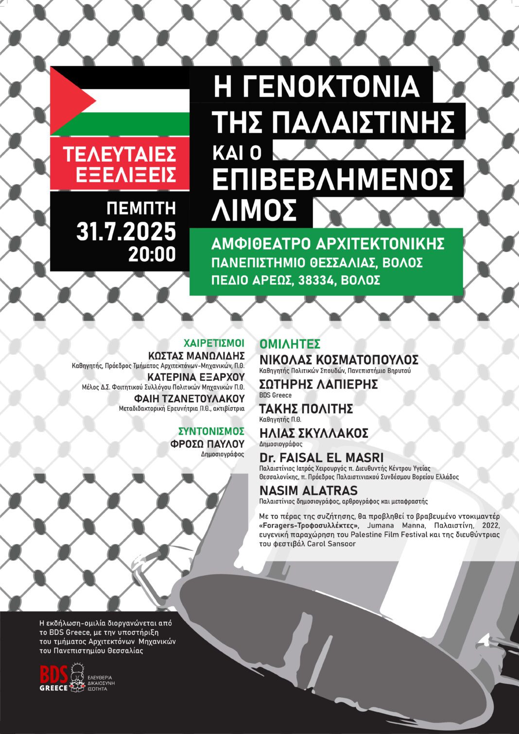 Η γενοκτονία του Παλαιστινιακού λαού αποτελεί μια από τις πιο σκοτεινές και τραγικές σελίδες της σύγχρονης ιστορίας. Για δεκαετίες, ο παλαιστινιακός πληθυσμός έχει υποστεί συστηματική βία, εκτοπίσεις, και απάνθρωπες συνθήκες ζωής υπό την κατοχή και τον αποικιακό έλεγχο. Από τη Nakba το 1948 έως τις τωρινές επιθέσεις στη Γάζα και τη Δυτική Όχθη, η εθνοκάθαρση, οι μαζικές δολοφονίες, και η καταστροφή ολόκληρων κοινοτήτων έχουν αφήσει ανυπολόγιστες ανθρώπινες απώλειες και τραύματα. Ειδικά μετά το σπάσιμο της βραχύβιας εκεχειρίας από το Ισραήλ, ο παλαιστινιακός λαός βιώνει μια συστηματική εκμηδένιση που πληροί κάθε κριτήριο του όρου της Γενοκτονίας, όπως ορίζεται στο Διεθνές Δίκαιο, σύμφωνα με τον νομικό ορισμό του άρθρου 2 της Σύμβασης για τη Γενοκτονία των Ηνωμένων Εθνών. Η Γάζα έχει μετατραπεί σε νεκροταφείο παιδιών μετά από βομβαρδισμούς, λιμό και στρατηγικές σφαγής αμάχων στους καταυλισμούς. Το Ισραήλ, με τη στήριξη της Δύσης καταστρέφει νοσοκομεία, σχολεία και υποδομές, και εξοντώνει οικογένειες, δημοσιογράφους και ιατρικό προσωπικό. Οι νεκροί μαζί με τους αγνοούμενους υπολογίζονται στις 350000, εκ των οποίων 40000 παιδιά, και 1,7 εκατομμύρια άνθρωποι βιώνουν μία ανθρωπιστική καταστροφή μέσα από τη στέρηση τροφής και νερού, ως η αιματηρή επίπτωση μιας πολιτικής που στοχεύει στην ολοκληρωτική εξάλειψη της Παλαιστίνης. Η διεθνής κοινότητα, με την αδράνεια και τη συνεργασία πολλών κρατών, γίνεται συνένοχη. Η Ελλάδα, η Ευρώπη και η Αμερική εξακολουθούν να εμποδίζουν την καταδίκη του Ισραήλ, ενώ πολυεθνικές εταιρείες εμπλέκονται στη στρατιωτική βιομηχανία του απαρτχάιντ. Στον Βόλο, όπου πρόσφατα δόθηκε από το Δήμο το κολυμβητήριο της πόλης σε αθλητές του Ισραήλ που βιαιοπράγησαν κατά πολιτών, αλλά και όπου διαρκώς υποδέχεται τα κρουαζιερόπλοια Ισραηλινών τουριστών, η εκδήλωση-ομιλία εστιάζει στη γενοκτονία της Παλαιστίνης μέσα από ιστορικά γεγονότα και ανθρώπινες μαρτυρίες. Επιδιώκει να αποδομήσει τη ρητορική των καταπιεστών, να φωτίσει τις συνέπειες της παγκόσμιας αδιαφορίας, να καλέσει σε άμεση δράση, και να υπενθυμίσει ότι η αντίσταση ενός λαού για αξιοπρέπεια και ελευθερία δεν είναι ποτέ “εξτρεμισμός”, αλλά δικαίωμα. Σε έναν κόσμο όπου η ανθρωπιά συχνά θυσιάζεται στο βωμό των γεωπολιτικών συμφερόντων, η υπόθεση της Παλαιστίνης παραμένει δοκιμασία της ηθικής μας συνείδησης. Η Γενοκτονία της Παλαιστίνης δεν είναι γεγονός του παρελθόντος – συμβαίνει τώρα, και η σιωπή μας είναι συνενοχή. Πρόγραμμα:ΧαιρετισμοίΚώστας Μανωλίδης, Καθηγητής, Πρόεδρος Τμήματος Αρχιτεκτόνων-Μηχανικών, Π.Θ.Κατερίνα Εξάρχου Μέλος Δ.Σ. Φοιτητικού Συλλόγου Πολιτικών Μηχανικών Π.Θ.Φαίη Τζανετουλάκου, Μεταδιδακτορική Ερευνήτρια Π.Θ., ακτιβίστριαΟμιλητέςΝικόλας Κοσματόπουλος, Καθηγητής Πολιτικών Σπουδών, Πανεπιστήμιο ΒηρυτούΣωτήρης Λαπιέρης, BDS GreeceΤάκης Πολίτης, Καθηγητής Π.Θ.Ηλίας Σκυλλάκος, ΔημοσιογράφοςDr. Faisal el Masri, Παλαιστίνιος Ιατρός Χειρουργός π. Διευθυντής Κέντρου Υγείας Θεσσαλονίκης, π. Πρόεδρος Παλαιστινιακού Συνδέσμου Βορείου ΕλλάδοςNasim Alatras, Παλαιστίνιος δημοσιογράφος, αρθρογράφος και μεταφραστήςΣυντονίζει η δημοσιογράφος Φρόσω Παύλου Με το πέρας της συζήτησης, θα προβληθεί το βραβευμένο ντοκιμαντέρ Foragers-Τροφοσυλλέκτες, Jumana Manna, Παλαιστίνη, 2022, ευγενική παραχώρηση του Palestine Film Festival και της διευθύντριας του φεστιβάλ Carol SansoorΗ εκδήλωση-ομι