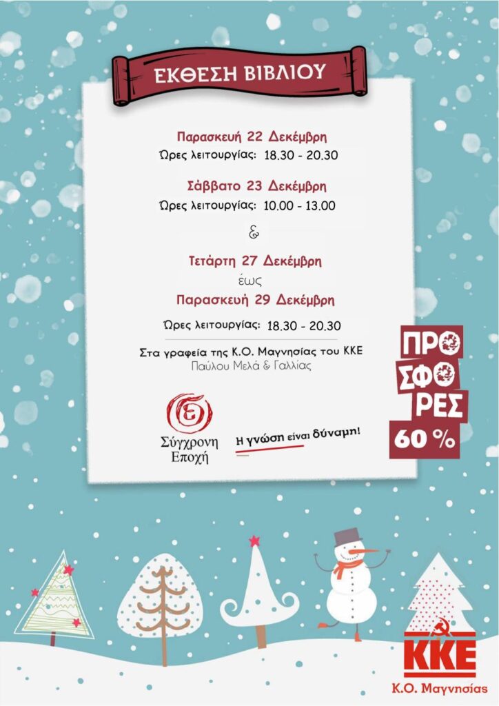 Η Τομεακή Επιτροπή Μαγνησίας του ΚΚΕ, σας προσκαλεί να συμμετέχετε στην Έκθεση Βιβλίου των εκδόσεων της “Σύγχρονης Εποχής”, που διοργανώνει από τις 20 έως τις 30 Δεκέμβρη, στα γραφεία της Κομματικής Οργάνωσης Μαγνησίας (Παύλου Μελά και Γαλλίας).