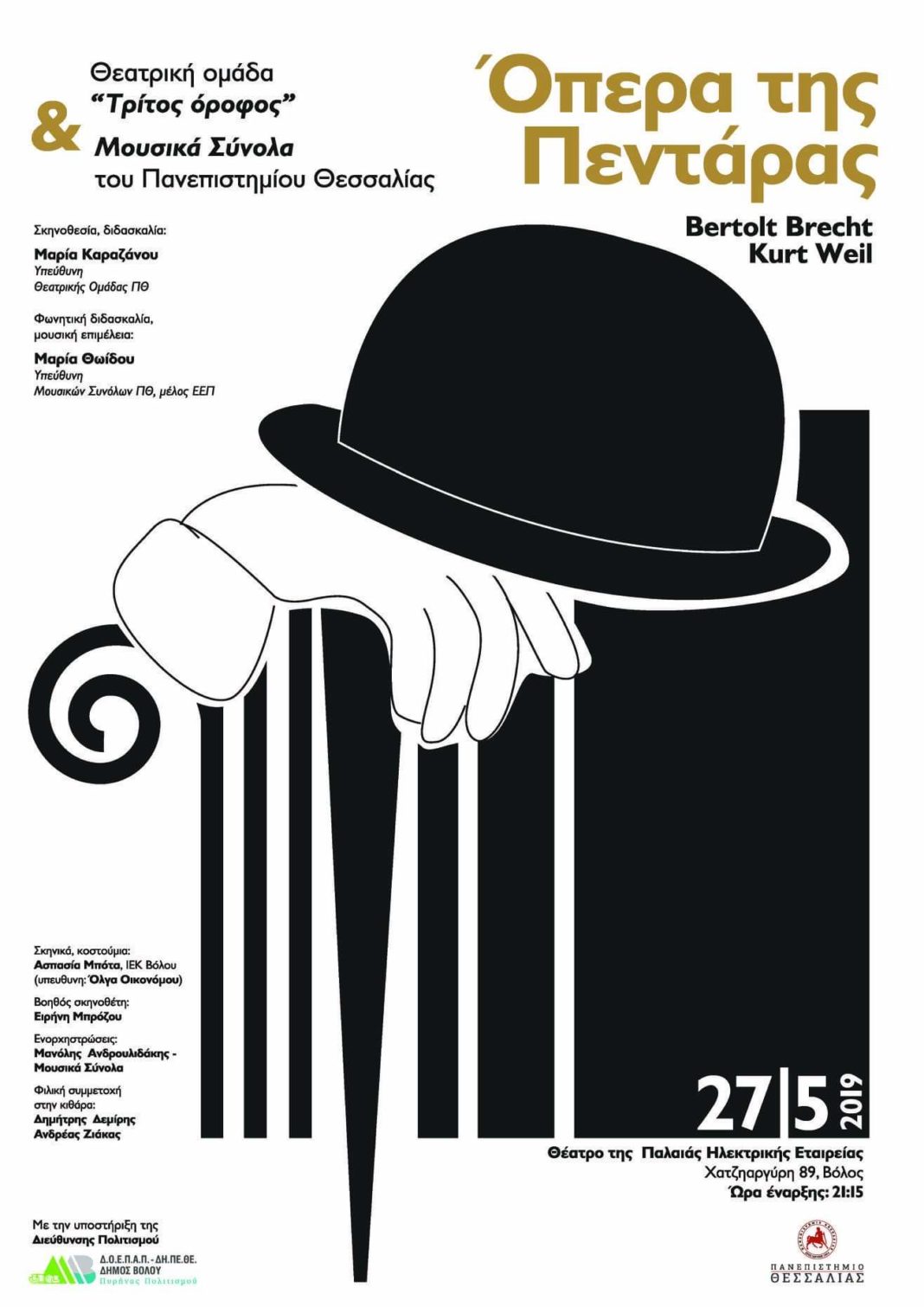 Τη Δευτέρα 27 Μαΐου 2019 και ώρα 21:15, στο Θέατρο της Παλιάς Ηλεκτρικής Εταιρείας (Χατζηαργύρη 89, Βόλος) η Θεατρική Ομάδα (Τρίτος Όροφος) συμπράττει επί σκηνής με τα Μουσικά Σύνολα του Πανεπιστημίου Θεσσαλίας στο έργο του Μπέρτολτ Μπρεχτ “Όπερα της πεντάρας”.